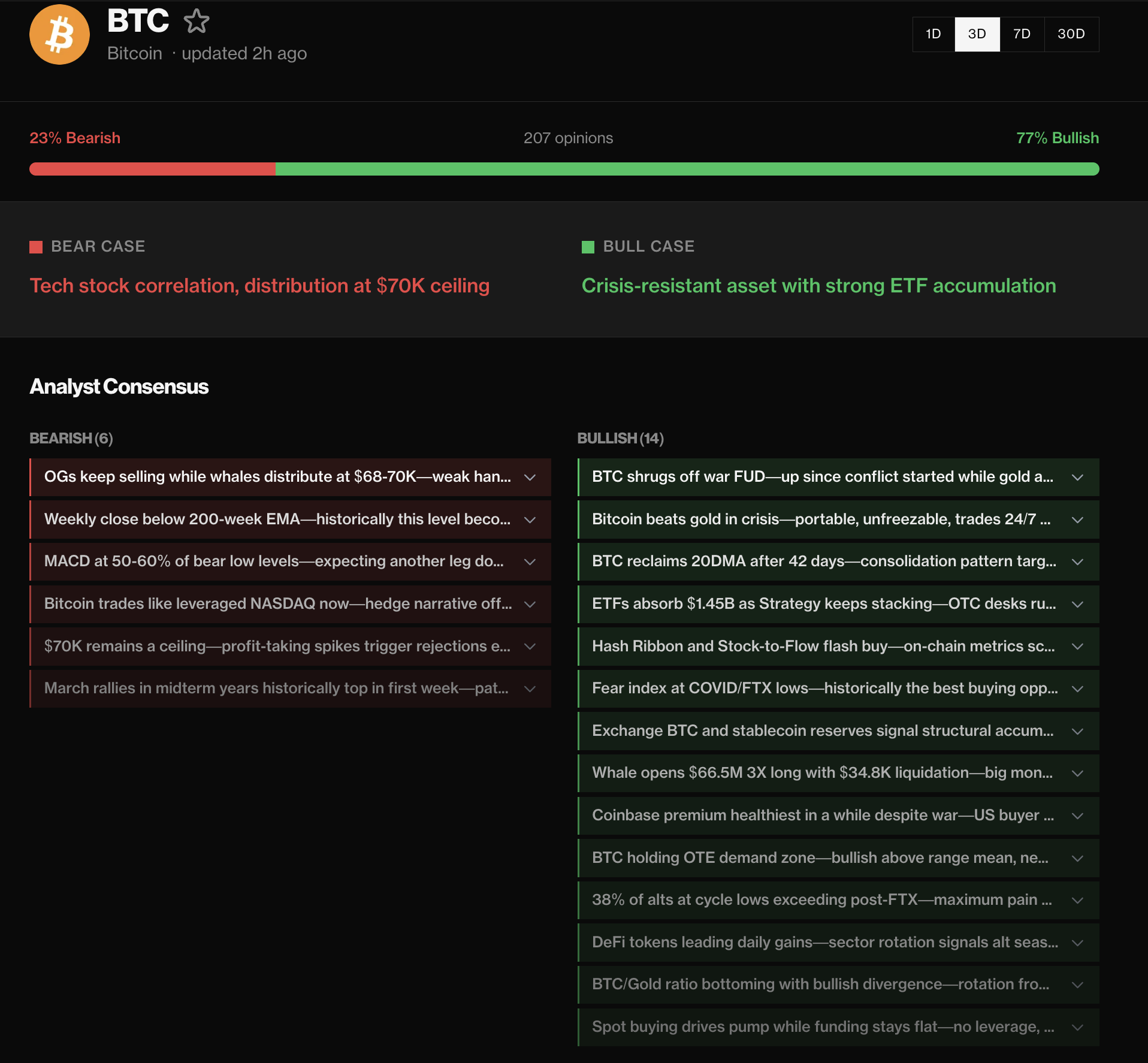 Los datos de Unbias, que rastrea a los principales analistas de criptomonedas, muestran un optimismo general en el mercado, proyectando un 77% de caso alcista en los últimos tres días basado en la fuerte acumulación de ETF. Mientras tanto, el 23% de caso bajista destaca el riesgo de correlación del Bitcoin con las acciones tecnológicas de EE.UU., que vieron salidas de más de 388 millones de dólares en febrero.