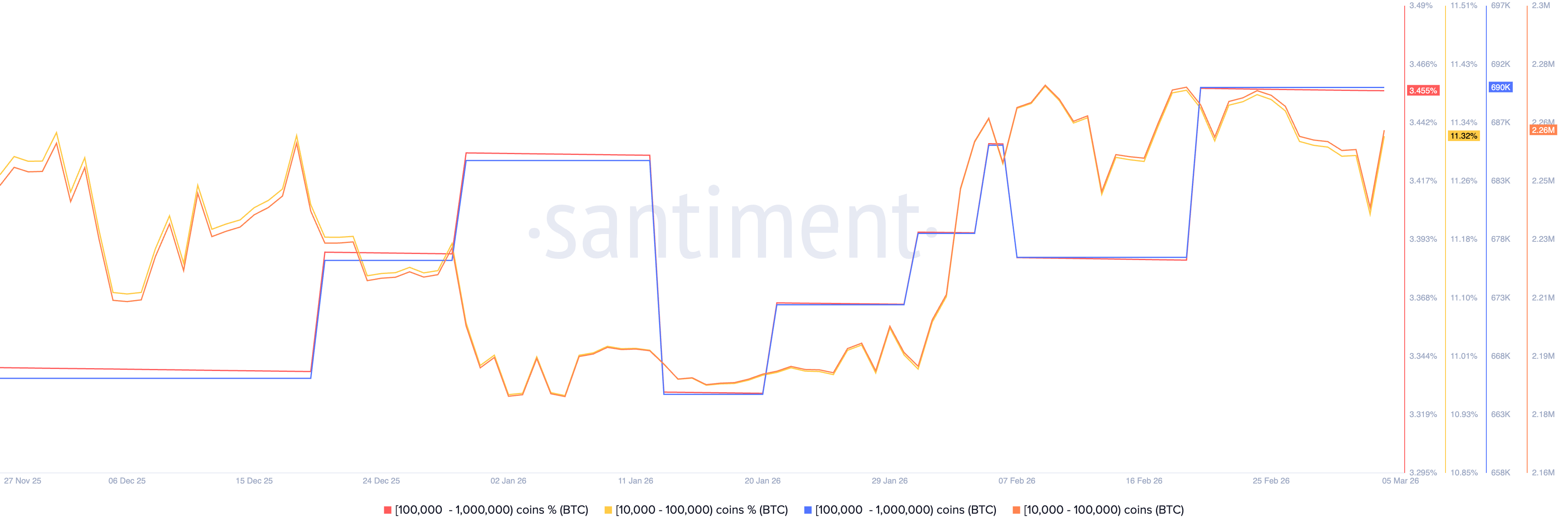 En el lado de la cadena, los inversores con grandes carteras están expandiendo sus tenencias, reflejando los movimientos institucionales. Los datos de Santiment muestran que los inversores con entre 10.000 y 100.000 $BTC poseen 2,26 millones de $BTC o el 11,32% de la oferta circulante, un aumento desde 2,24 millones de $BTC el miércoles. Esto sugiere que los grupos con grandes tenencias de $BTC, popularmente conocidos como ballenas, anticipan una mayor recuperación en el Bitcoin.