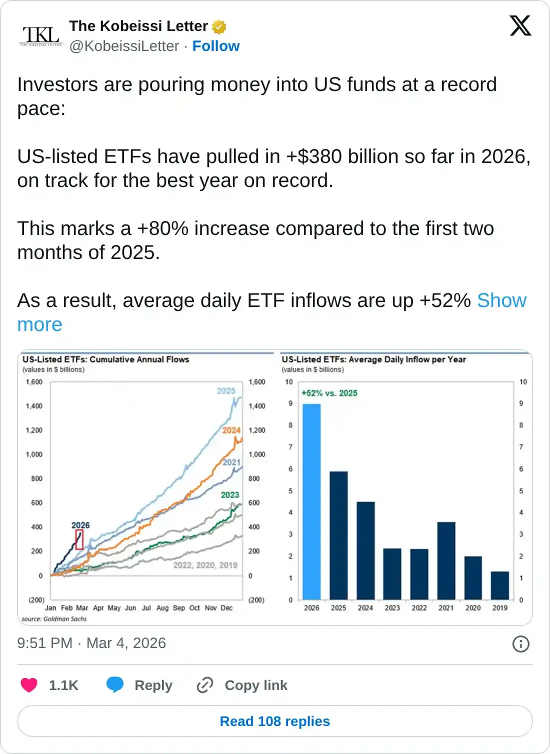 La guerra entre EE.UU. e Irán entra en su sexto día sin señales de reducción en los ataques aéreos en Oriente Medio. El mercado bursátil estadounidense mantuvo ganancias el miércoles, ya que los ETF listados en EE.UU. han promediado más de 9 millones de dólares en entradas diarias hasta ahora este año, totalizando más de 380.000 millones de dólares.