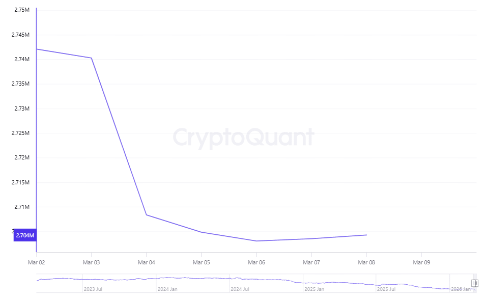 Según CryptoQuant, al inicio de la semana la cantidad de $BTC en las plataformas centralizadas de comercio era de 2.742.120 bitcoins, mientras que este domingo hay una actualización a la baja hasta los 2.704.352 bitcoins.