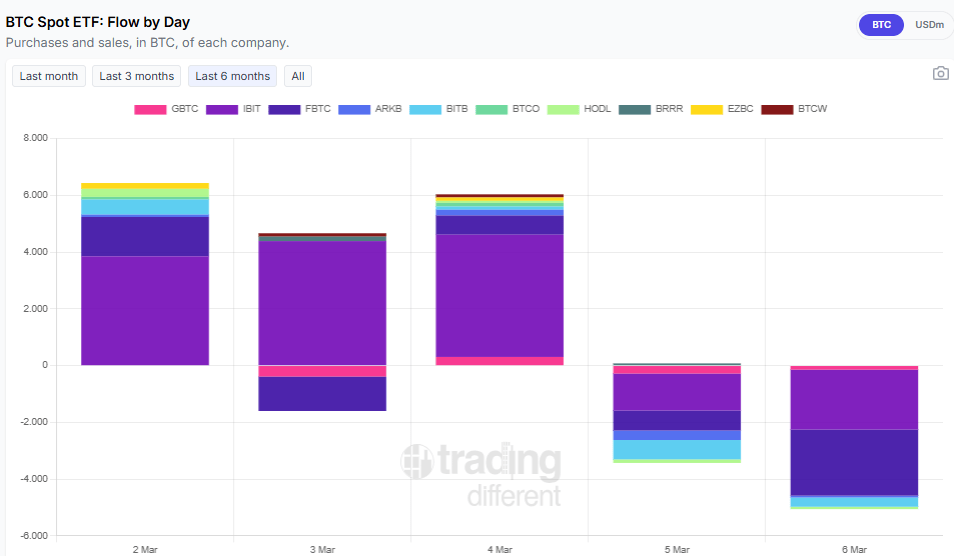Sin embargo, el jueves las carteras de Wall Street cambiaron de parecer y comenzaron a solicitar reembolsos de sus capitales. Entre el jueves y viernes, los ETF de $BTC experimentaron salidas de $576.8 millones. Esto dejó la puerta abierta para que los flujos de salida se extiendan hacia la próxima semana que arranca este 9 de marzo.