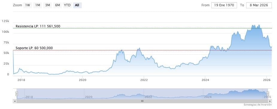 El soporte a mediano y largo plazo se encuentra en los 60.500 dólares. Mientras, los indicadores de Ei se muestran mixtos.