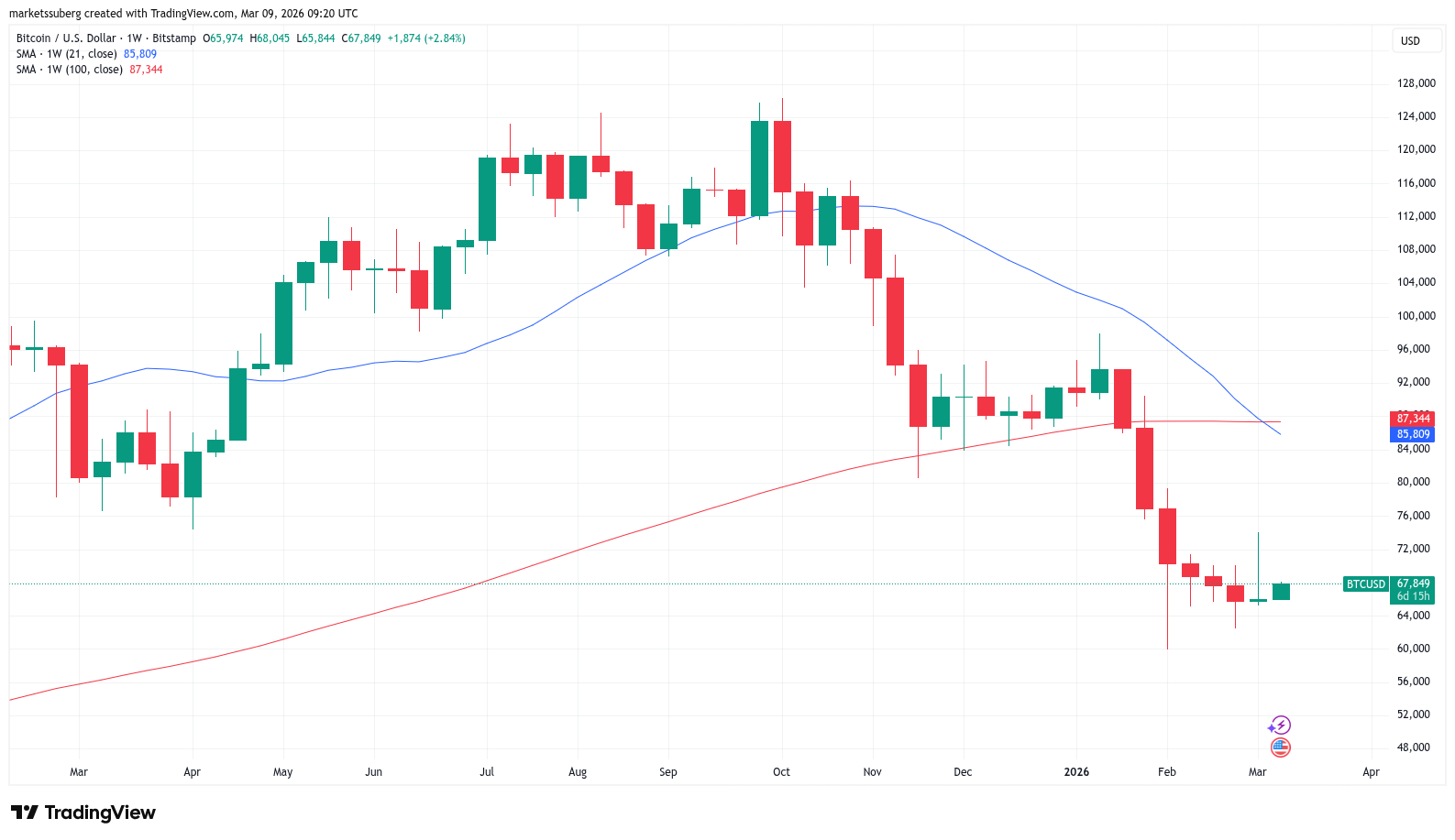 La media móvil simple (SMA) de 21 semanas cayó por debajo de su equivalente de 100 semanas al final de la semana, lo que supone una clásica señal bajista que refuerza la perspectiva de una mayor caída del precio del $BTC.
