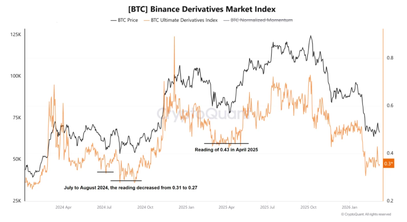 El índice del mercado de derivados de Binance, que combina diversas métricas del mercado para ofrecer una visión del impulso general, está imitando actualmente los mínimos locales del precio del $BTC en 2024 y 2025.