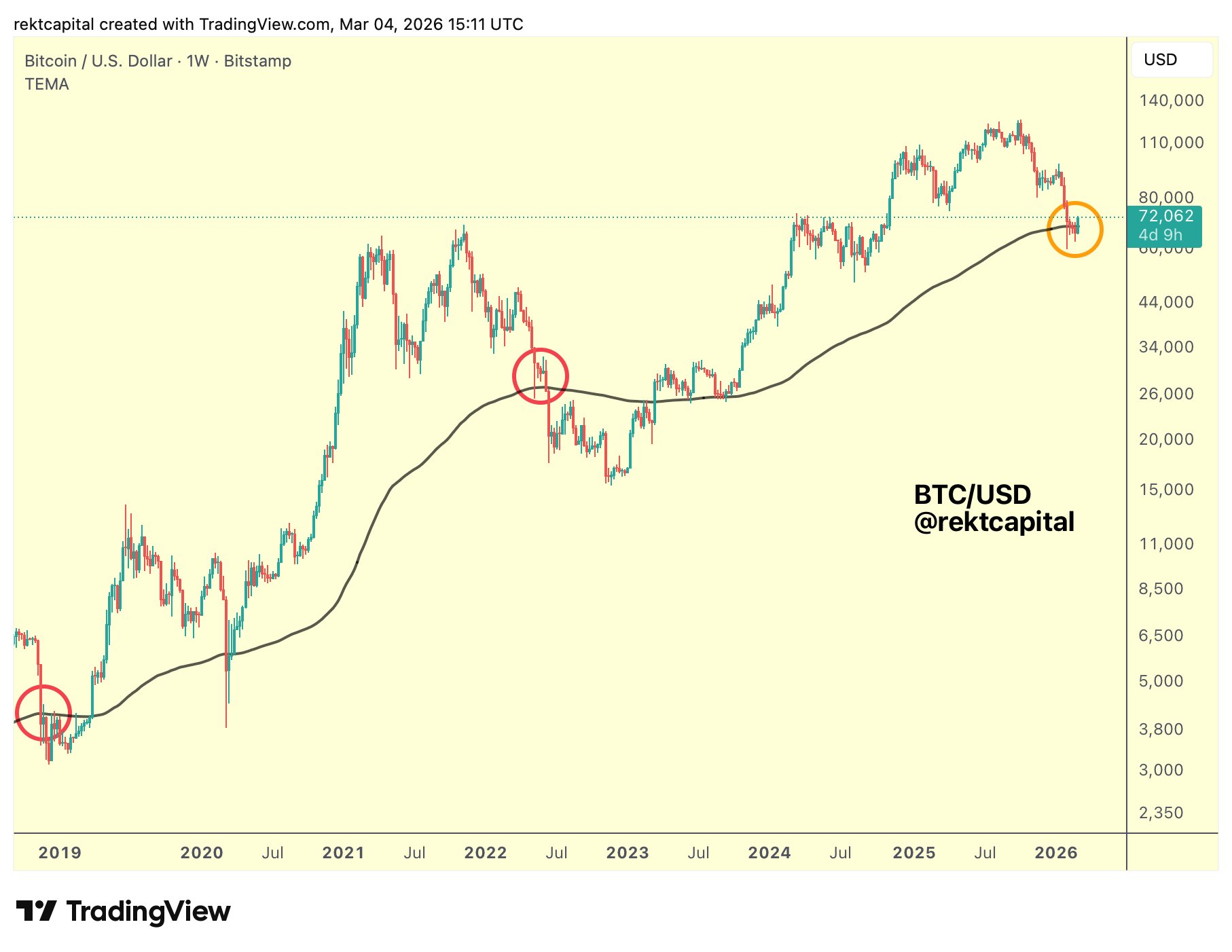 "La media móvil exponencial (EMA) de 200 semanas sigue actuando como techo para el precio hasta que se demuestre lo contrario".