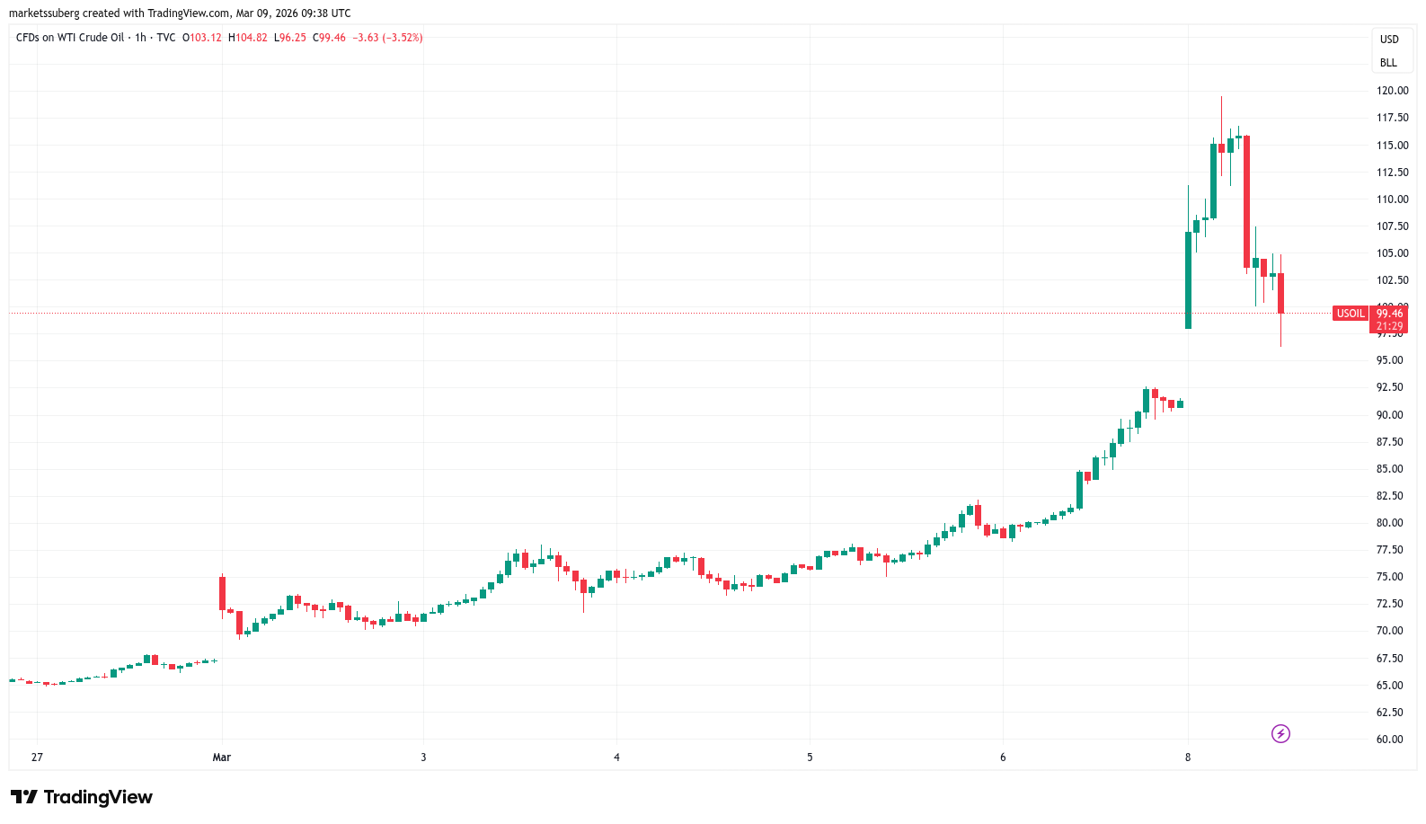 At 10:30 PM ET, US oil prices were up as much as +30% on the day.