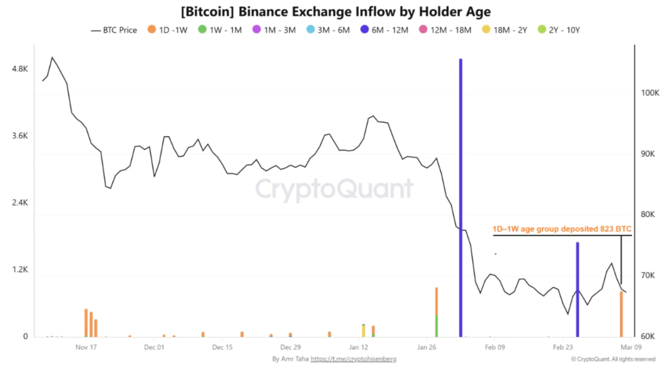 CryptoQuant revela que, el 7 de marzo, el aumento de las entradas en Binance procedía en su gran mayoría de monedas que se habían movido durante la semana anterior.
