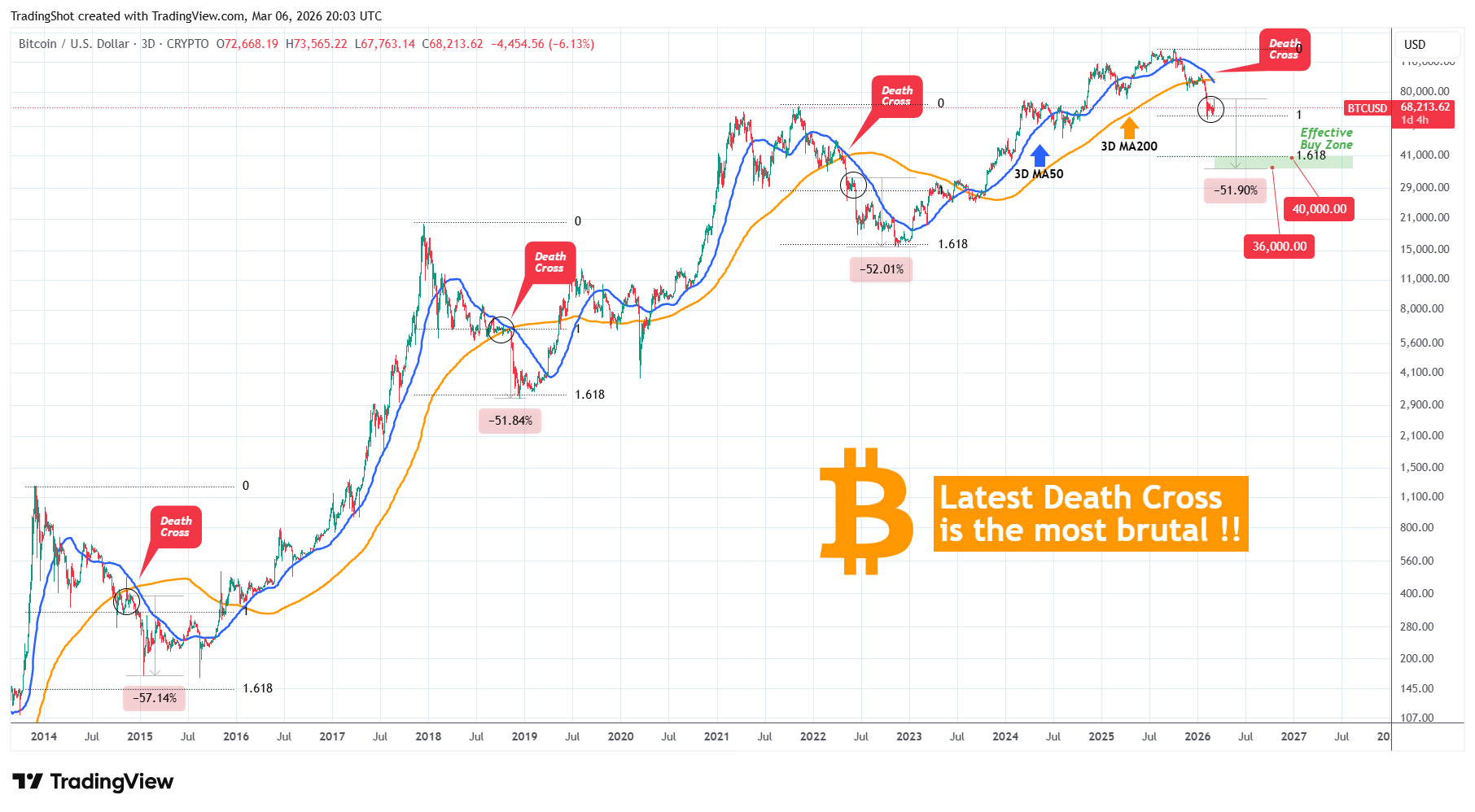 "Dado que también ha probado en dos de los tres ciclos bajistas anteriores la extensión de Fibonacci de 1,618 desde el nivel de esa cruz de la muerte, el bitcoin debería apuntar a la zona de USD 40.000 - USD 36.000", dijo a sus seguidores de X.