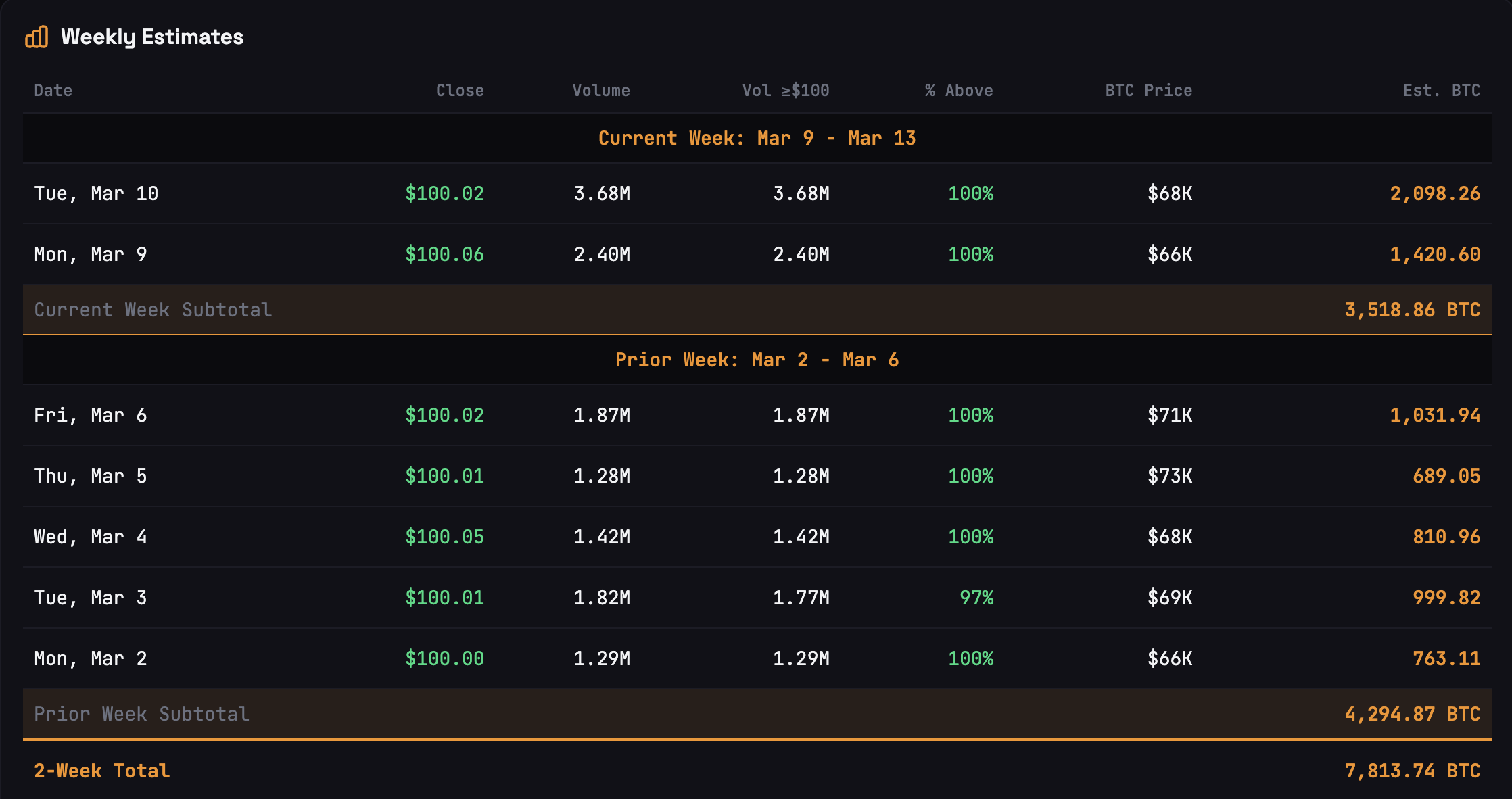 Solo esta semana, se estima que Strategy ha adquirido más de 3.500 $BTC tras vender aproximadamente 6 millones de acciones STRC a través de su programa at-the-market (ATM), según muestra el recurso de datos STRC.LIVE.
