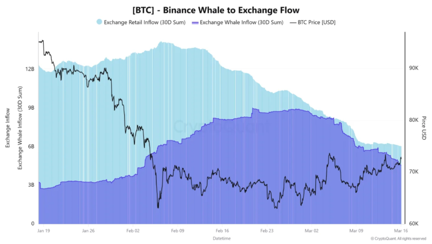 Taha señaló que los flujos desde billeteras minoristas y de grandes holders (whales) hacia Binance han caído significativamente en marcos móviles de 30 días. Por ejemplo, las entradas de whales bajaron de USD 8.800 millones a USD 4.500 millones en las primeras dos semanas de marzo.