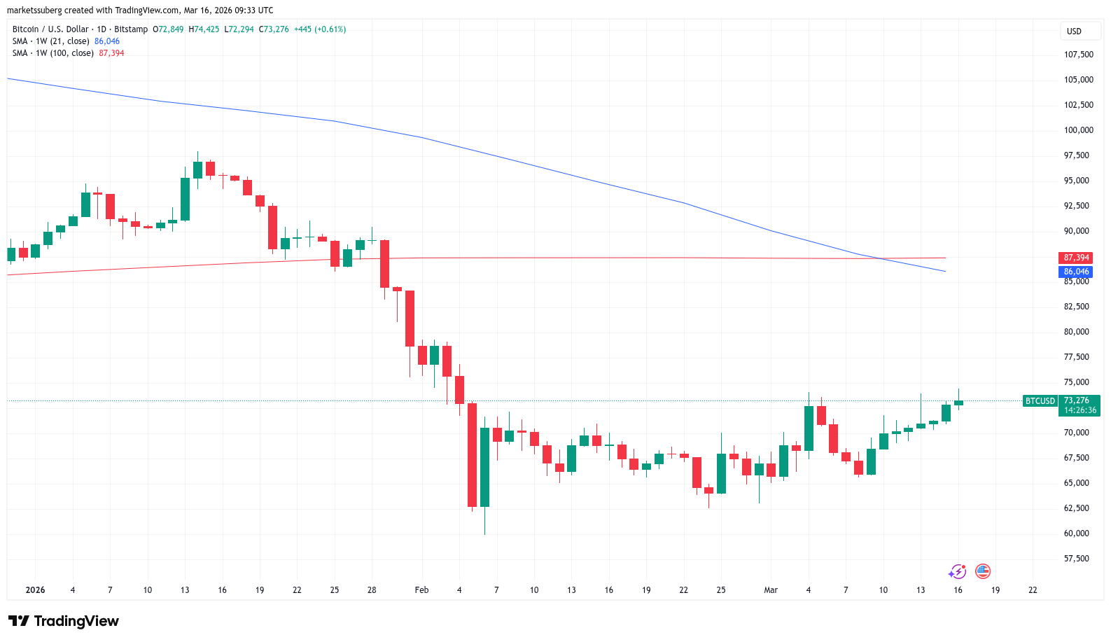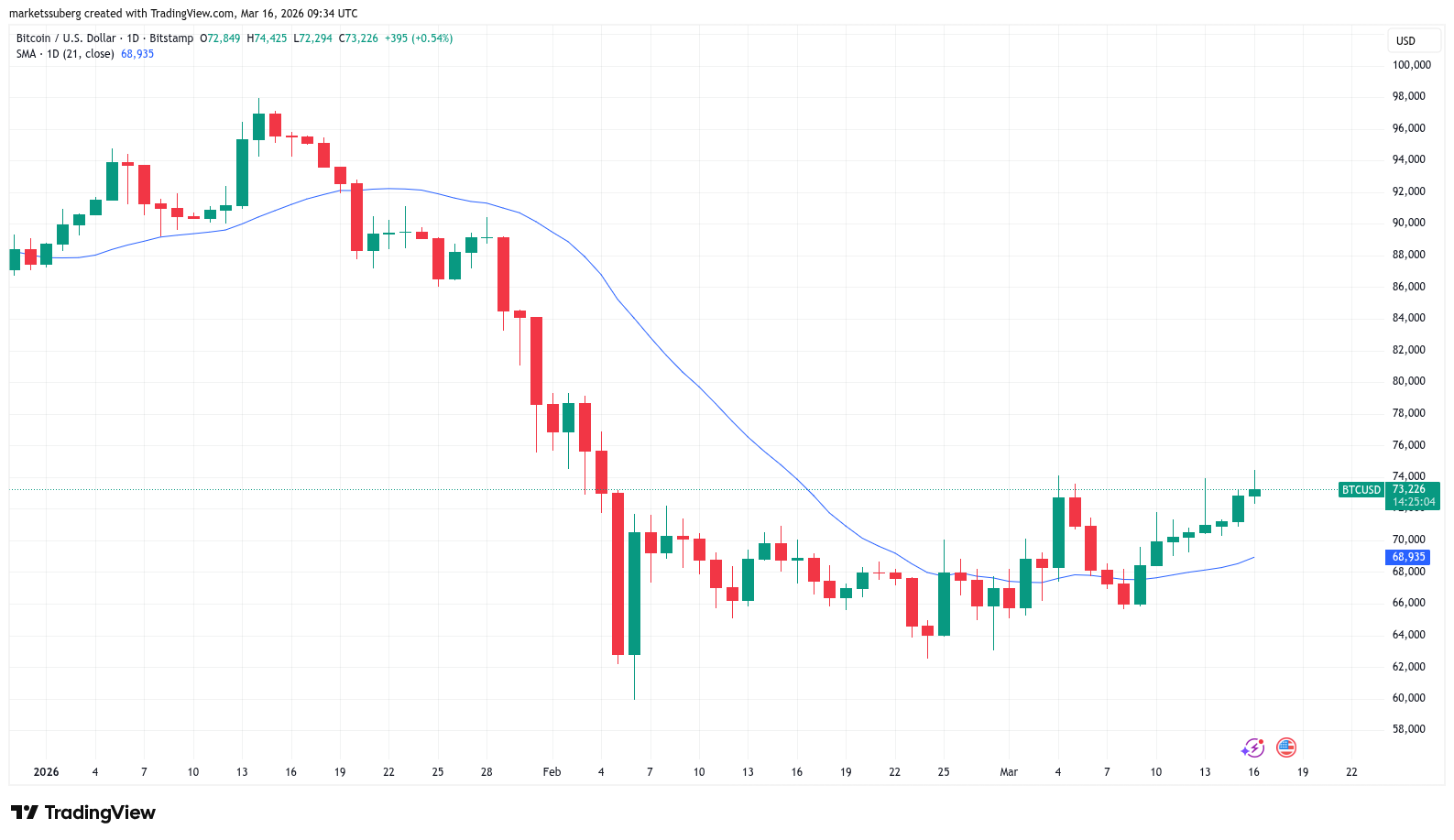Bitcoin ($BTC) comienza la tercera semana de marzo luchando por una ruptura alcista tras acercarse a USD 75.000.