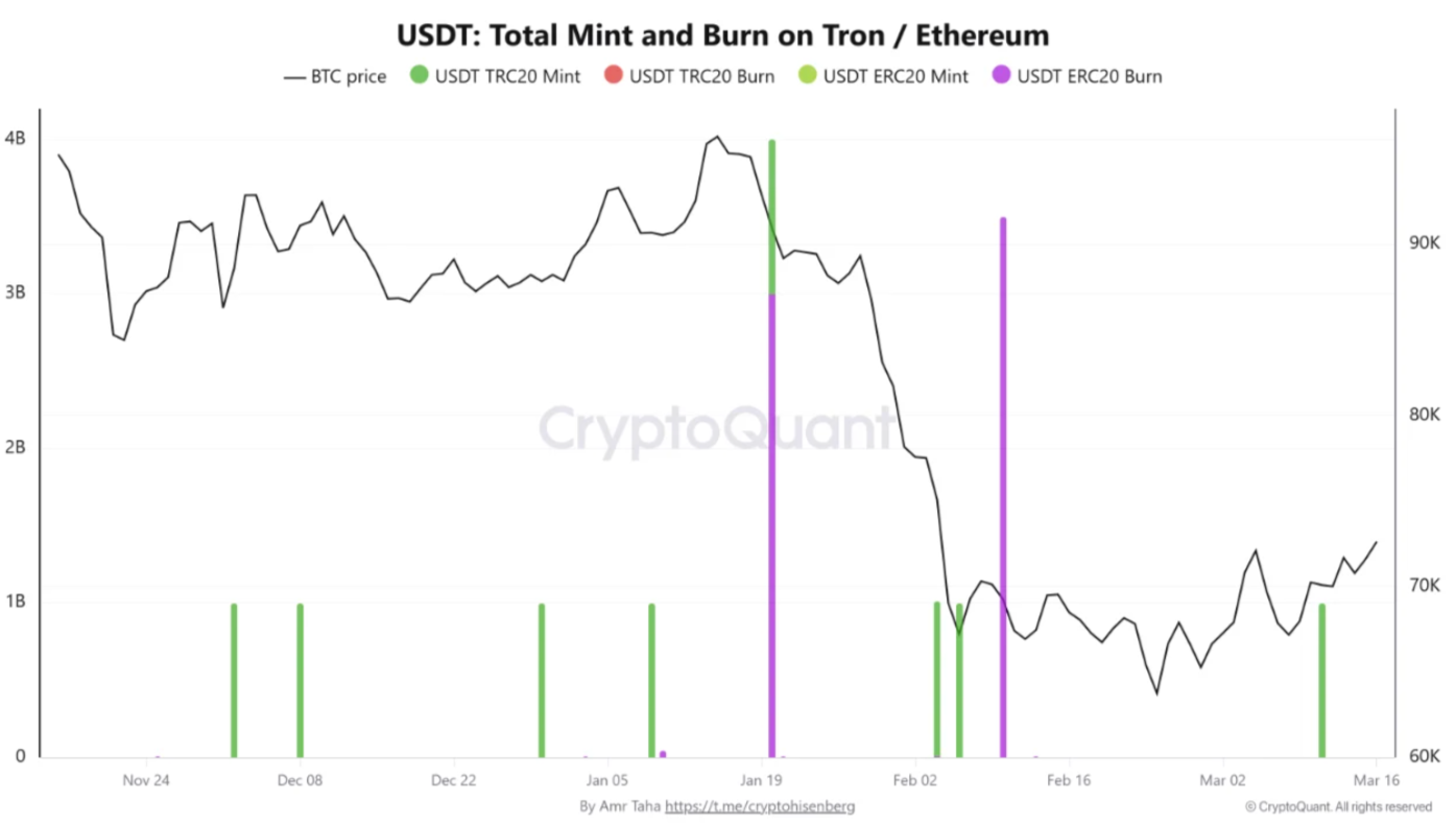 El 11 de marzo, además, se produjo una emisión de USD 1.000 millones de Tether ($USDT) en la red de Tron, en un evento significativo de expansión de liquidez.