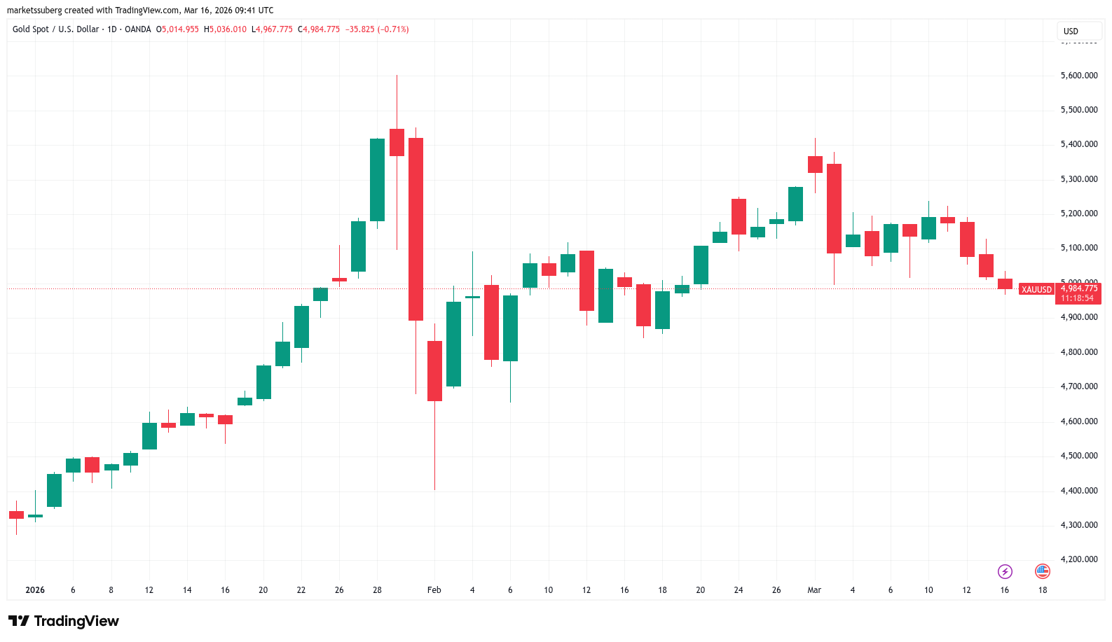 XAU/USD cayó por debajo de los USD 5.000 al inicio de la semana, alcanzando sus niveles más bajos desde mediados de febrero. Frente a Bitcoin, el oro descendió a niveles no vistos desde el 5 de febrero.