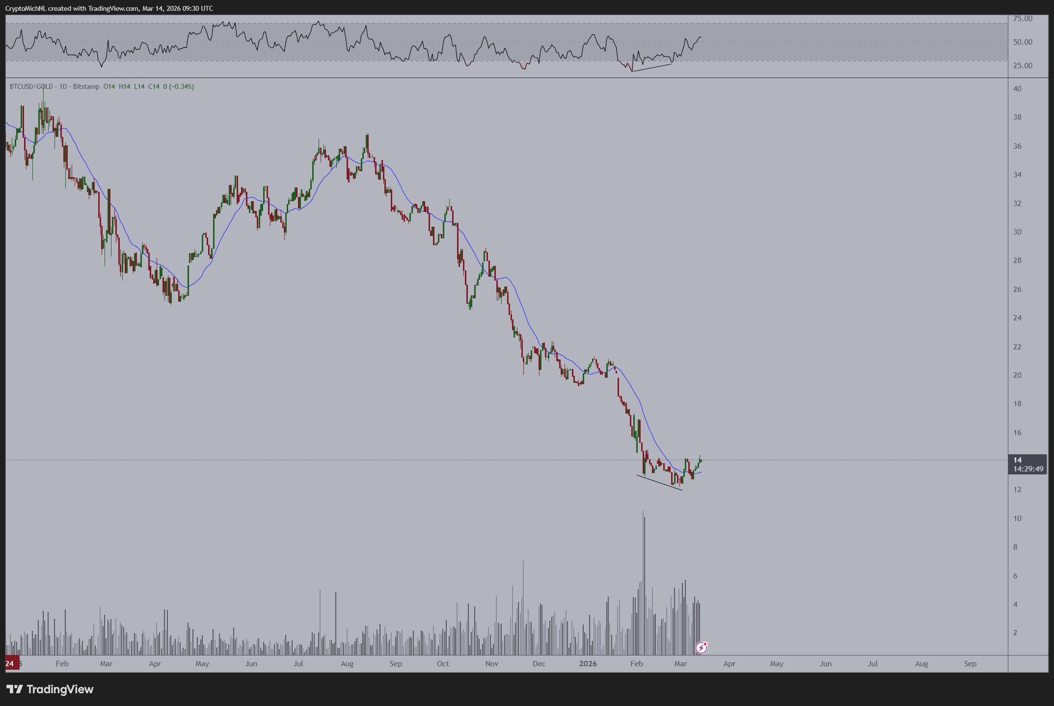 Durante el fin de semana, el trader cripto Michaël van de Poppe volvió a destacar una divergencia alcista emergente en el índice de fuerza relativa (RSI) del par $BTC/XAU.