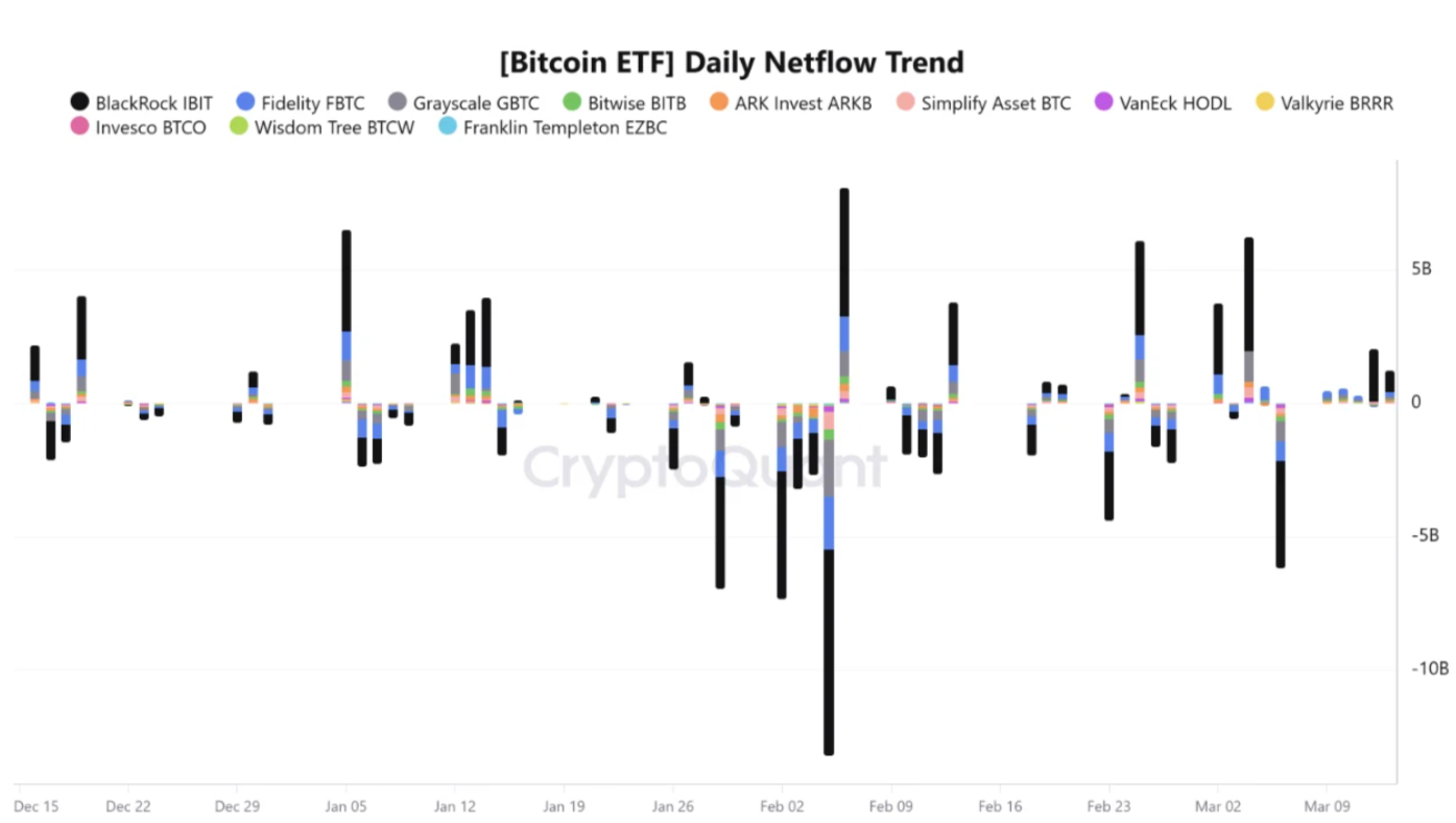 Al mismo tiempo, los ETF spot de Bitcoin en Estados Unidos han registrado entradas netas todos los días de negociación desde el 9 de marzo.