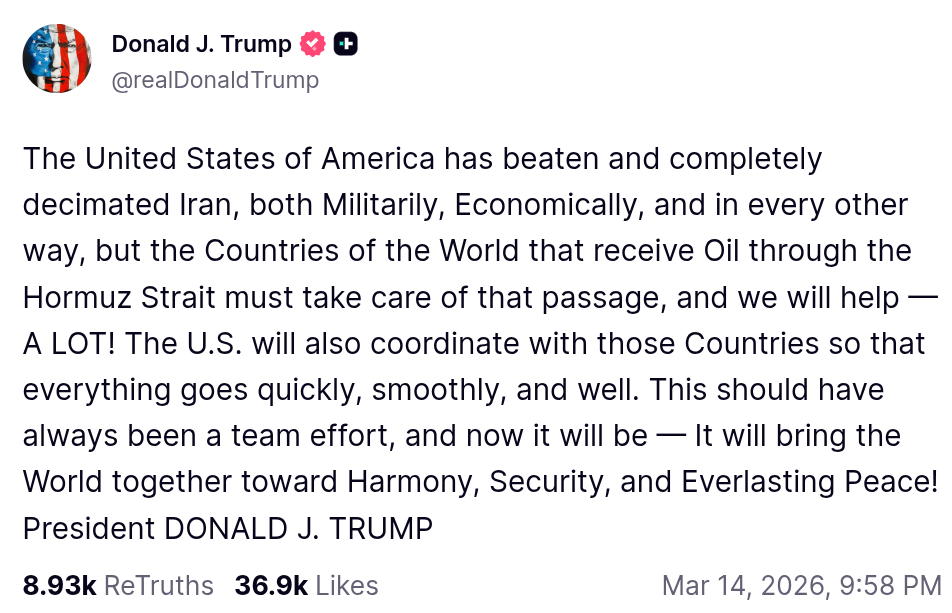 En una publicación en Truth Social, Trump escribió que “los países del mundo que reciben petróleo a través del Estrecho de Ormuz deben cuidar ese paso, y nosotros ayudaremos — ¡MUCHO!”.