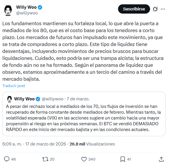 A través de su cuenta en la red social X, Woo analizó hoy, 17 de marzo de 2026, la estructura actual del precio y la liquidez que sostiene el rally. Según el especialista, aunque los fundamentos de bitcoin mantienen una «fortaleza local» que podría empujar el precio hacia la zona de los 80.000 dólares, la naturaleza de los compradores actuales sugiere fragilidad.