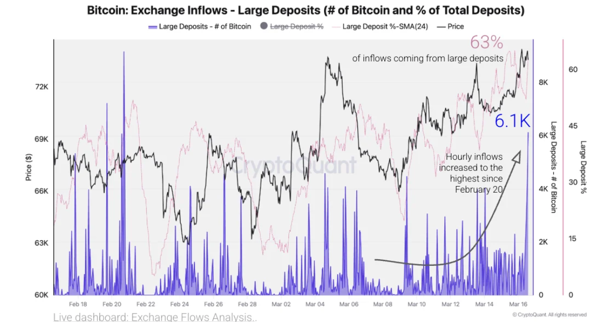 Notablemente, el 63% de estas entradas provino de grandes depósitos, un patrón históricamente asociado con una posible presión de venta a medida que los inversores mueven activos a los exchanges.