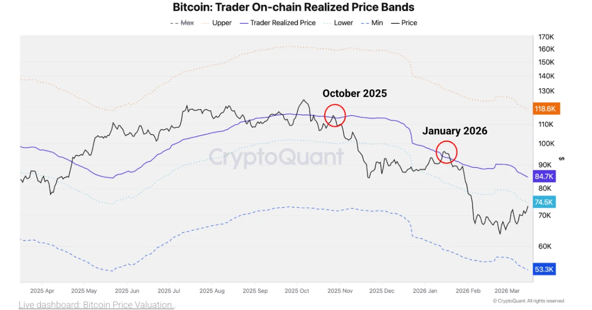 Además, la perspectiva a corto plazo de Bitcoin apunta a niveles de resistencia clave por delante, según CryptoQuant. El analista afirmó que el $BTC podría encontrar primero resistencia en 75.000$, alineándose con la banda inferior del Precio Realizado en cadena de los Traders.
