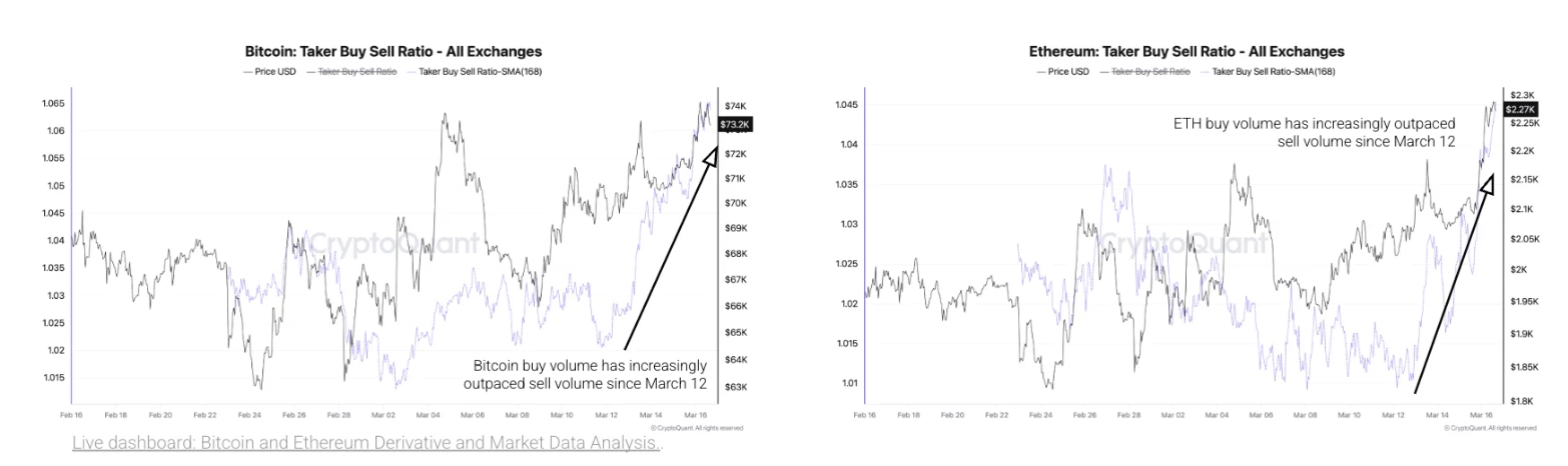 El informe también señala un aumento en las órdenes de compra entre los operadores. El Ratio de Volumen de Compra/Venta de Taker se ha mantenido por encima de 1.0 tanto para Bitcoin como para Ethereum, indicando que la actividad de compra continúa superando la presión de venta. El aumento marca su nivel más alto desde octubre de 2025, señalando que los operadores se están posicionando para precios más altos, afirmaron los analistas de CryptoQuant.