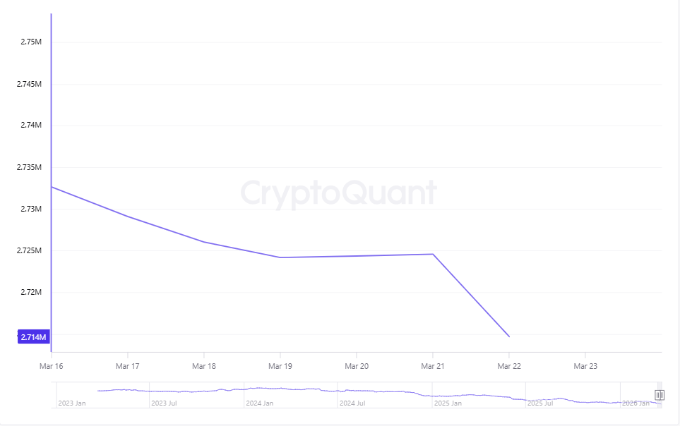 Por otra parte, la tendencia decreciente multianual de las reservas de $BTC en los exchanges se mantuvo esta semana. Esto se refleja en el gráfico de CryptoQuant, donde se observa un claro descenso semanal de estas reservas.