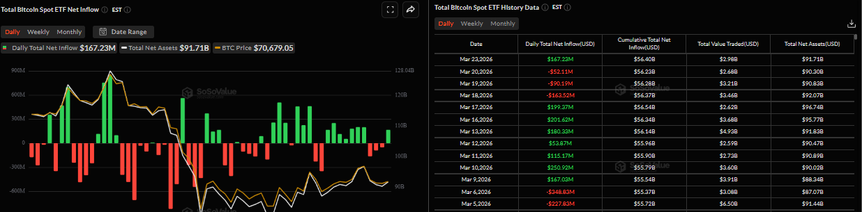 El Bitcoin ($BTC) cotiza en rojo alrededor de la marca de 70.000$ al momento de escribir el martes, tras una fuerte recuperación el día anterior. La demanda institucional y corporativa respalda la recuperación del $BTC, ya que los fondos cotizados en bolsa (ETFs) al contado registraron nuevas entradas mientras que Strategy (MSTR) añadió más $BTC a sus reservas el lunes. Los operadores deben ser cautelosos, ya que la volatilidad podría aumentar para el Rey de las Criptomonedas, ya sea en un escenario de acuerdo o sin acuerdo entre EE.UU. e Irán.