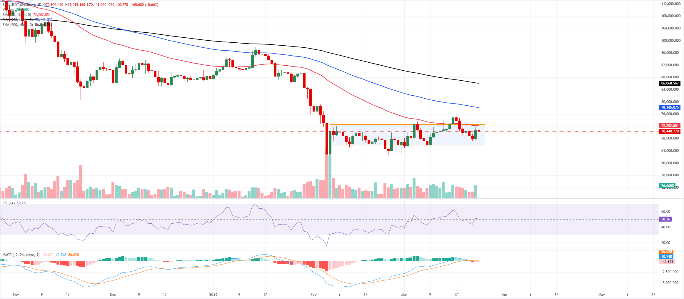 La resistencia inicial se alinea alrededor de la EMA de 50 días cerca de 72.200$, y un cierre diario por encima de este nivel abriría el camino hacia la parte superior del canal en 72.600$ y el pico del 17 de marzo en 76.000$.