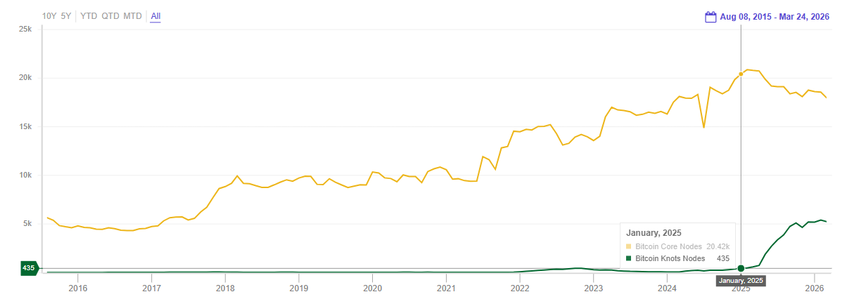 Ese salto se explica en gran parte por la disputa en torno a OP_RETURN. Cuando Bitcoin Core v30 decidió ampliar el límite de datos que ese opcode permite, una parte significativa de la comunidad, que rechaza los usos no financieros de Bitcoin, migró a Knots.