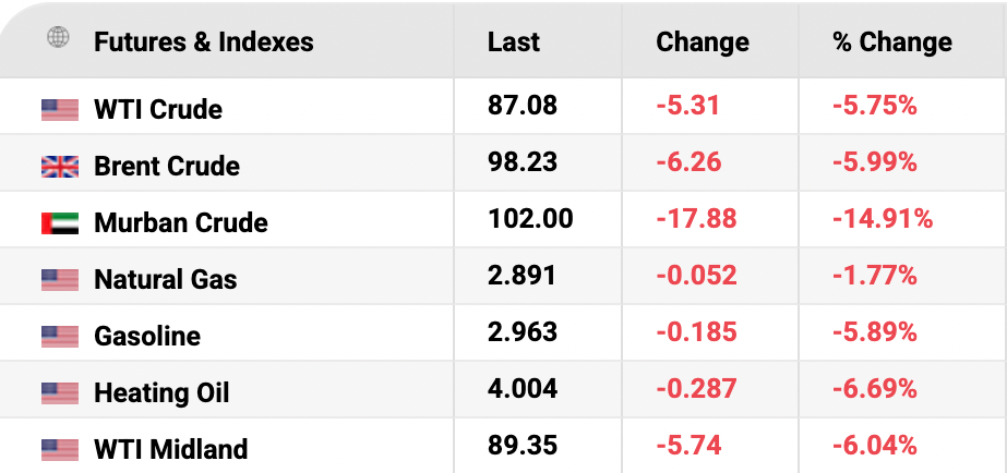 Tras la noticia, el petróleo crudo WTI cayó un 5,75% hasta los USD 87 por barril, mientras que el crudo Brent perdió un 6% para cotizar en USD 98.
