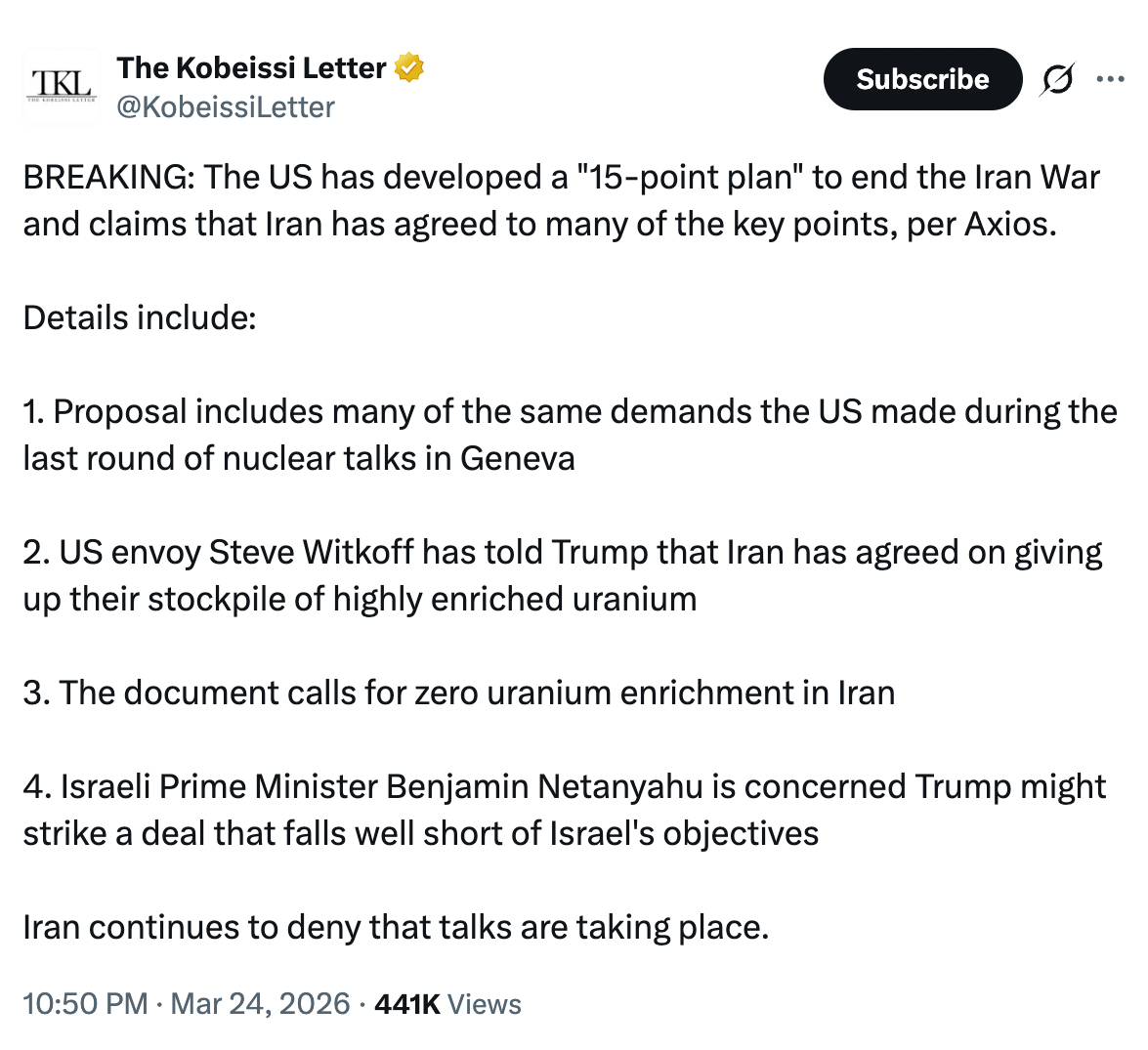 El precio reaccionó a la noticia de que EE. UU., a través del mediador principal, el General de Ejército Syed Asim Munir (Jefe del Estado Mayor del Ejército de Pakistán), ha enviado a Irán un plan de 15 puntos destinado a poner fin a la guerra.