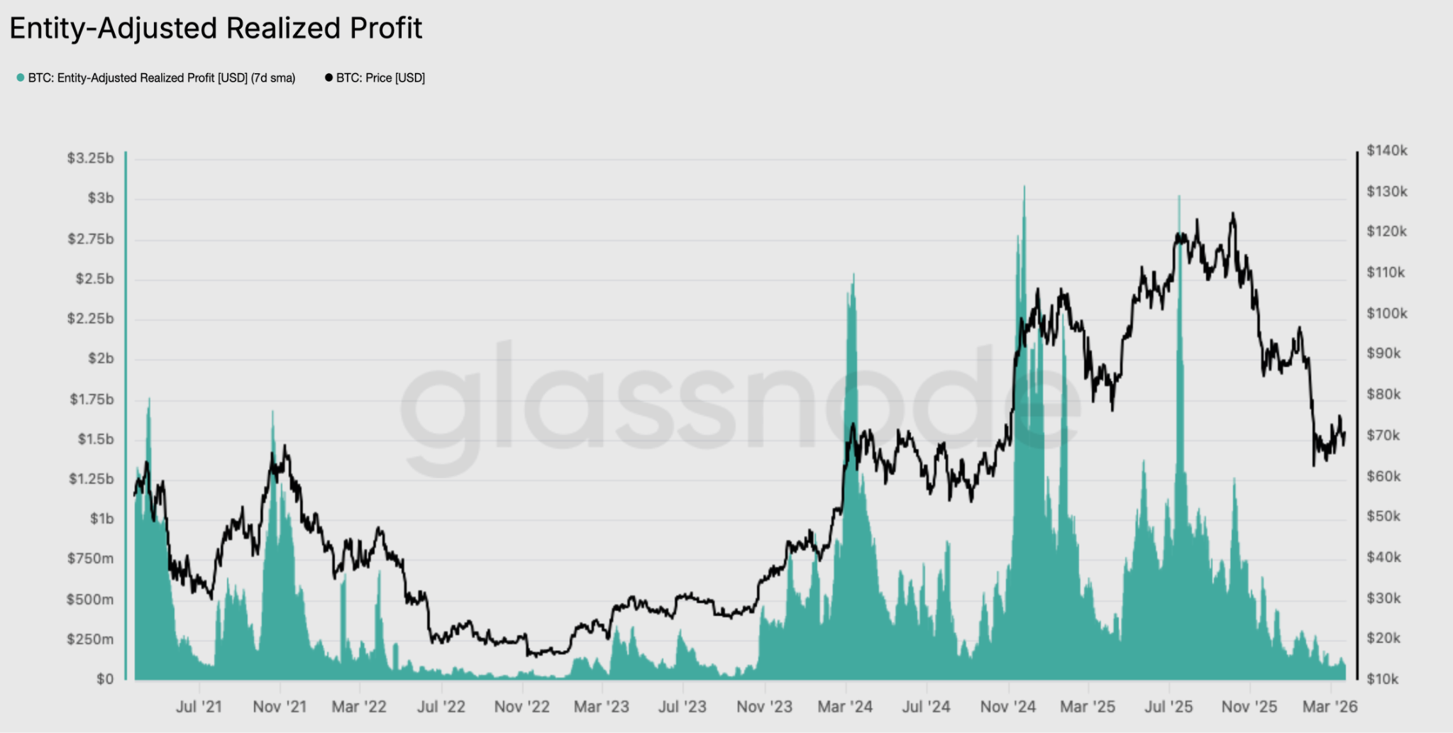 La ganancia realizada de Bitcoin ajustada por entidades también ha caído desde un máximo de USD 3.000 millones por día en julio de 2025 a menos de USD 0,1 mil millones en la actualidad.