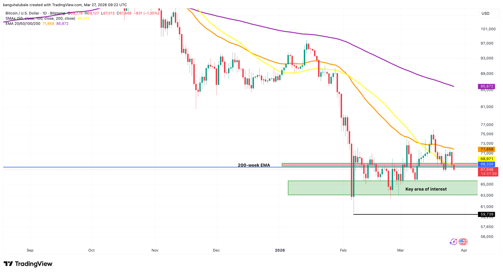 El par $BTC/USD se cotizaba por debajo de los 67.000 dólares al momento de escribir este artículo, por debajo de la media móvil simple (SMA) de 50 días y la media móvil exponencial (EMA) de 200 semanas.
