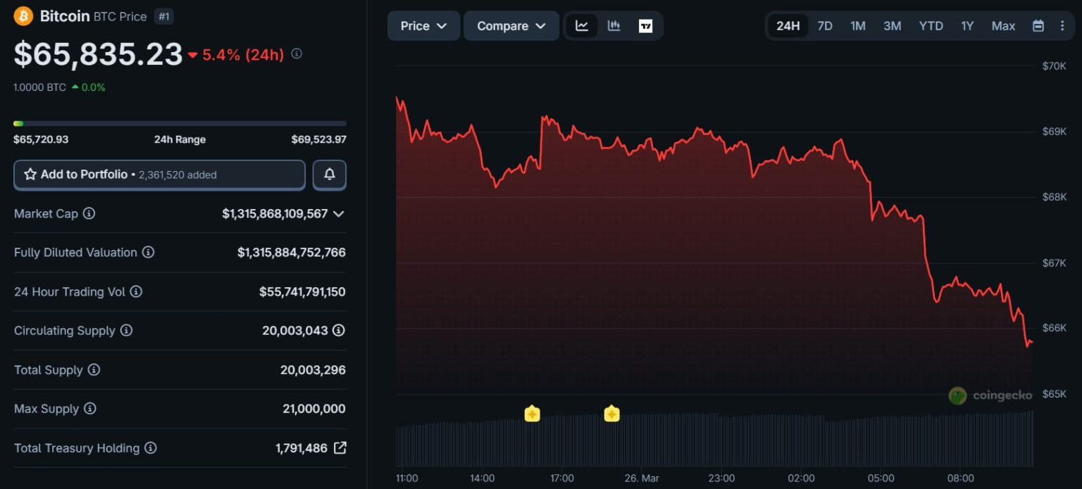 Bitcoin también perdió tracción. La criptomoneda había estado rondando los USD $70.000 horas antes, pero luego volvió a la zona de USD $66.000. El precio de $BTC está en el rango de los USD $65.800 al momento de publicar este artículo, más de 5% por debajo en 24 horas.