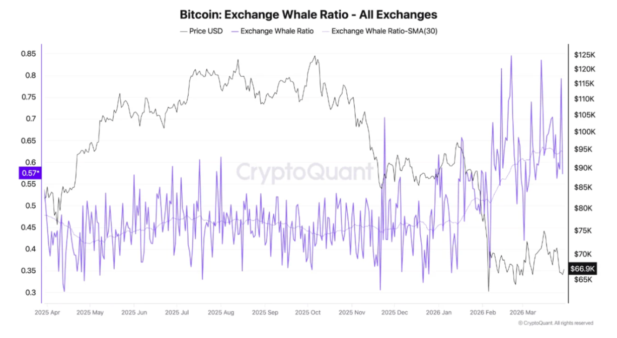 CryptoQuant señaló un aumento de la presencia de ballenas entre los flujos de entrada a los exchanges, con sus billeteras representando una mayor proporción de las transacciones entrantes de mayor tamaño.