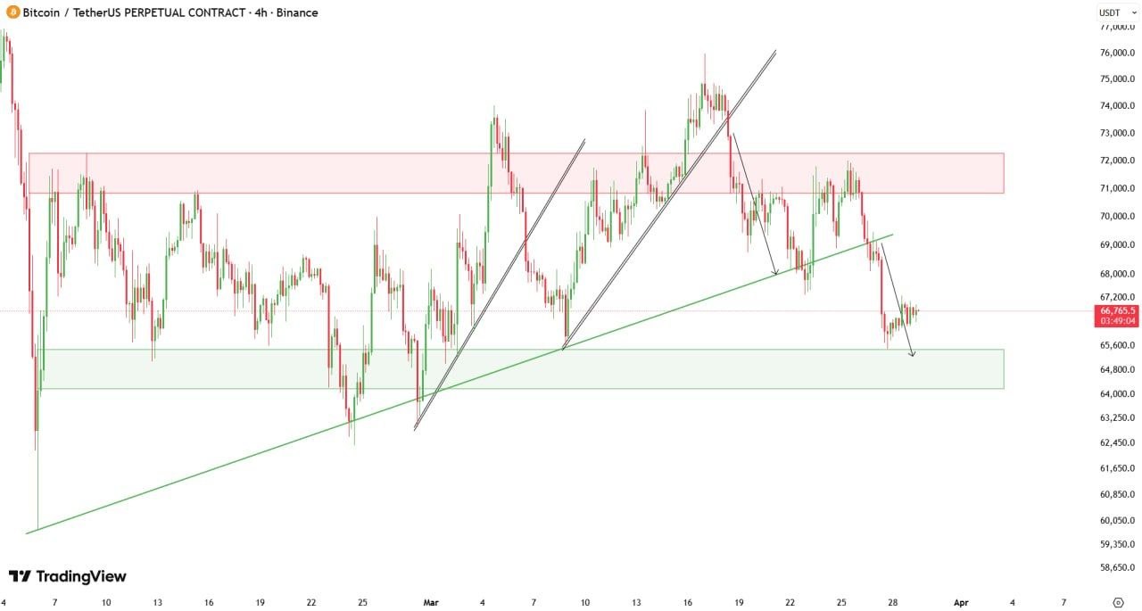 La acción del precio de $BTC toca los USD 65.000 al inicio de la semana, mientras los traders esperan una ruptura bajista tipo bear flag.