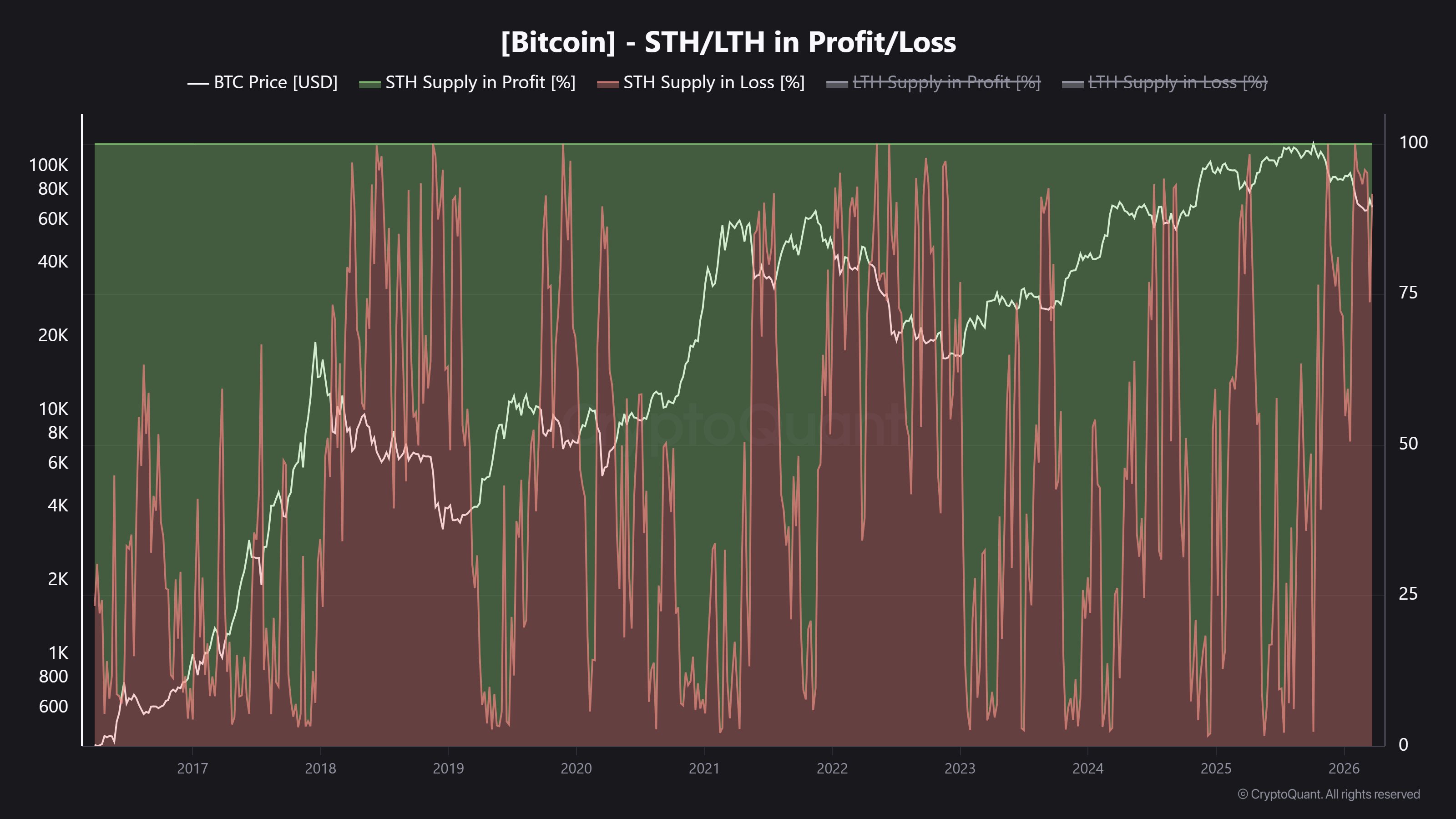 La semana pasada, CryptoQuant calculó la participación de los STH en la oferta total en 5,7 millones de $BTC, con un 92% en pérdidas.
