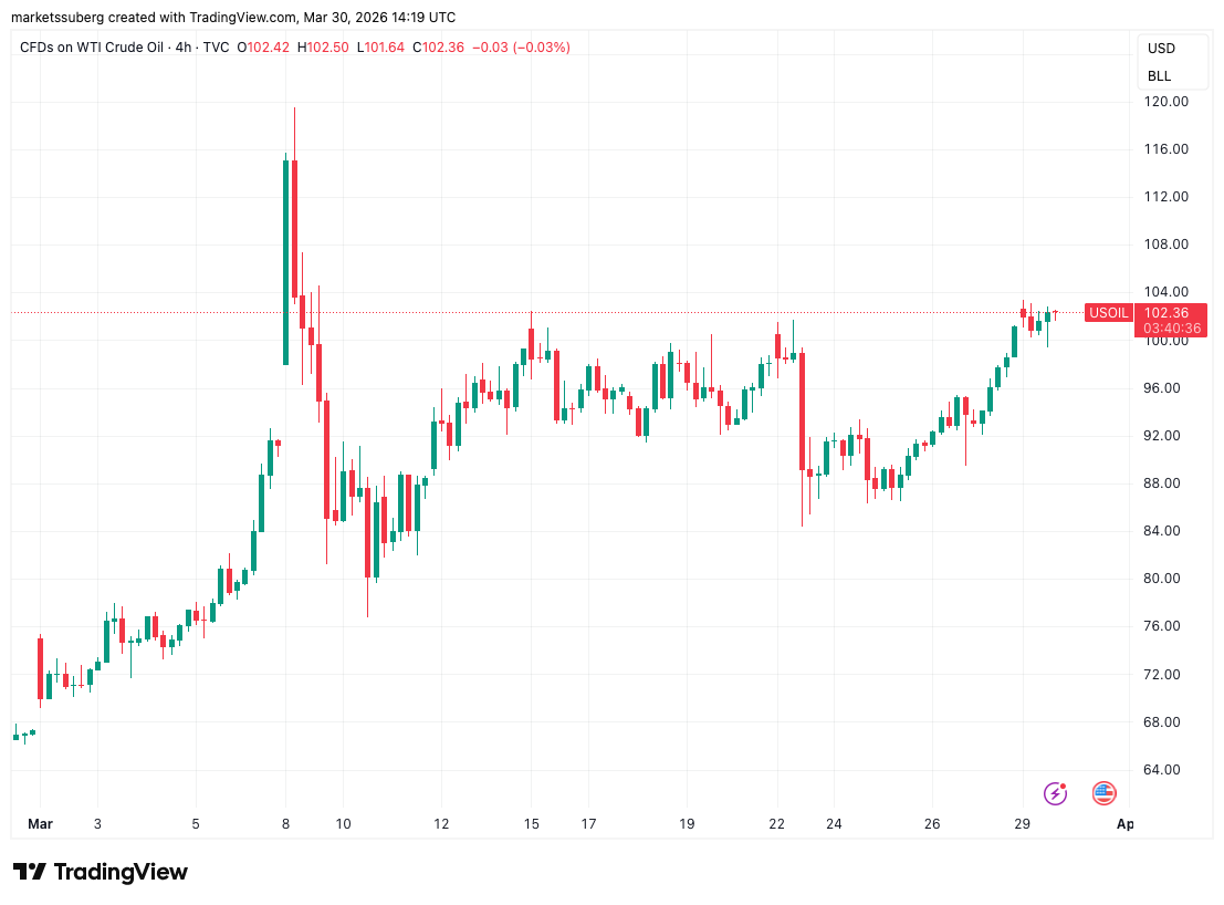 El petróleo mantuvo la marca de los USD 100 este lunes 30 de marzo de 2026, mientras que las acciones estadounidenses lucharon por consolidar ganancias al inicio de la semana.