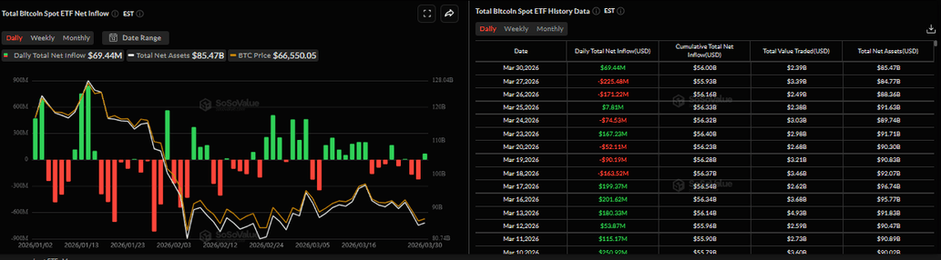 La demanda institucional comenzó la semana con una nota ligeramente positiva. Los datos de SoSoValue muestran que los ETF de Bitcoin al contado registraron una entrada moderada de 69.44 millones de dólares el lunes tras dos días consecutivos de retiros la semana pasada. Los operadores deben mantenerse vigilantes, ya que estas entradas son modestas y no lo suficientemente fuertes para impulsar la recuperación del $BTC, lo que sugiere que los inversores no están dispuestos a aumentar su exposición al $BTC en medio de la guerra en curso. Para que la recuperación se mantenga, la demanda institucional debe continuar e intensificarse.