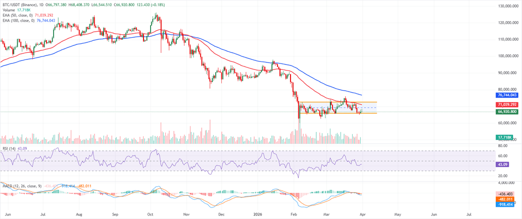 El precio del Bitcoin se negocia cerca de 67.000$ el martes tras una ligera recuperación, volviendo a probar el límite inferior de un canal horizontal cerca de los 65.900$ el día anterior. El sesgo a corto plazo es levemente bajista ya que el precio se mantiene dentro de un canal paralelo y cotiza cerca del límite inferior, manteniendo la presión a la baja en foco. Las medias móviles exponenciales (EMA) de 50 y 100 días alrededor de 71.000$ y 76.700$, respectivamente, permanecen muy por encima del precio al contado, subrayando una fase correctiva dentro de una tendencia alcista más amplia.