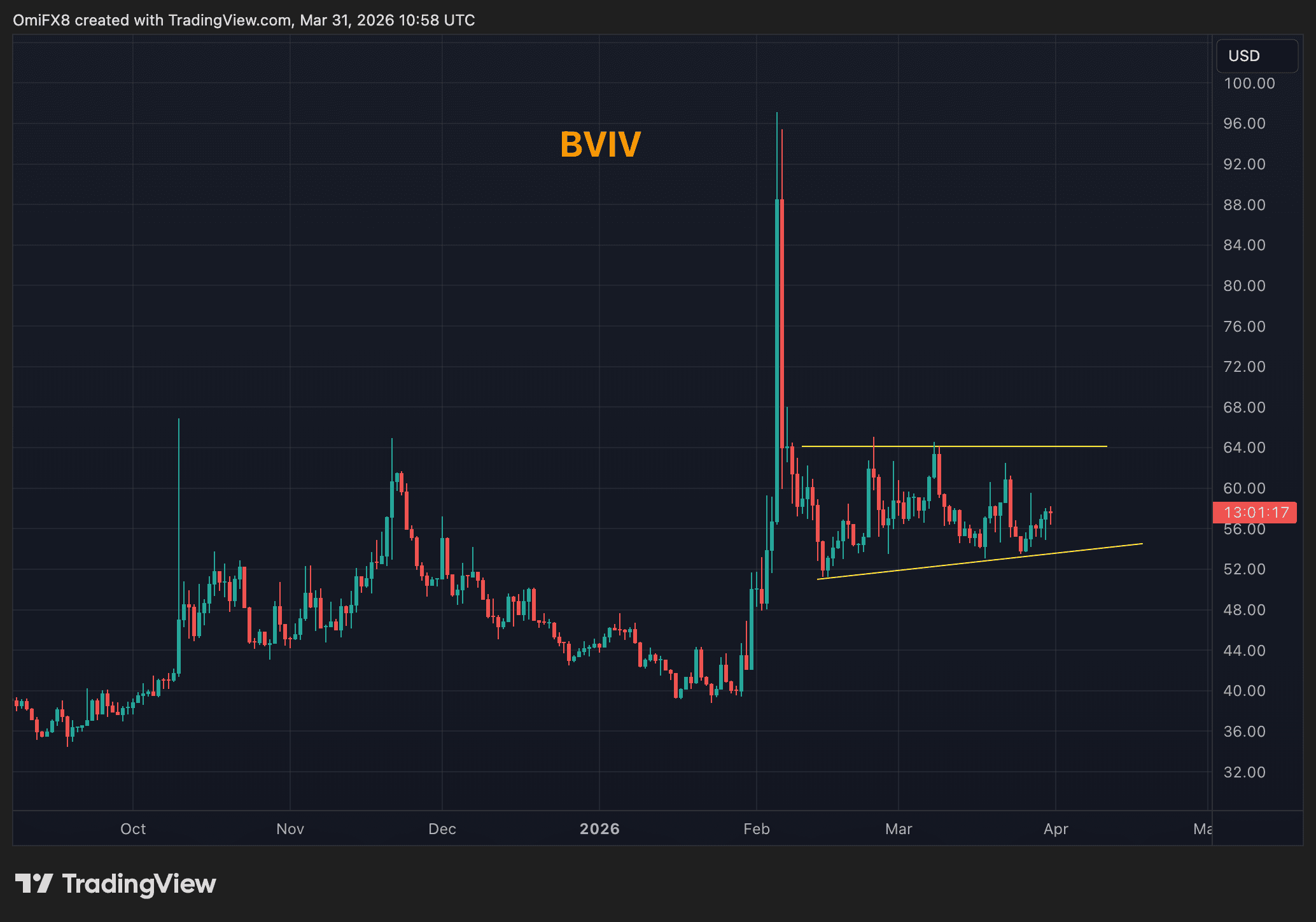 - El gráfico muestra las fluctuaciones diarias en el índice de volatilidad implícita a 30 días de bitcoin, BVIV.
