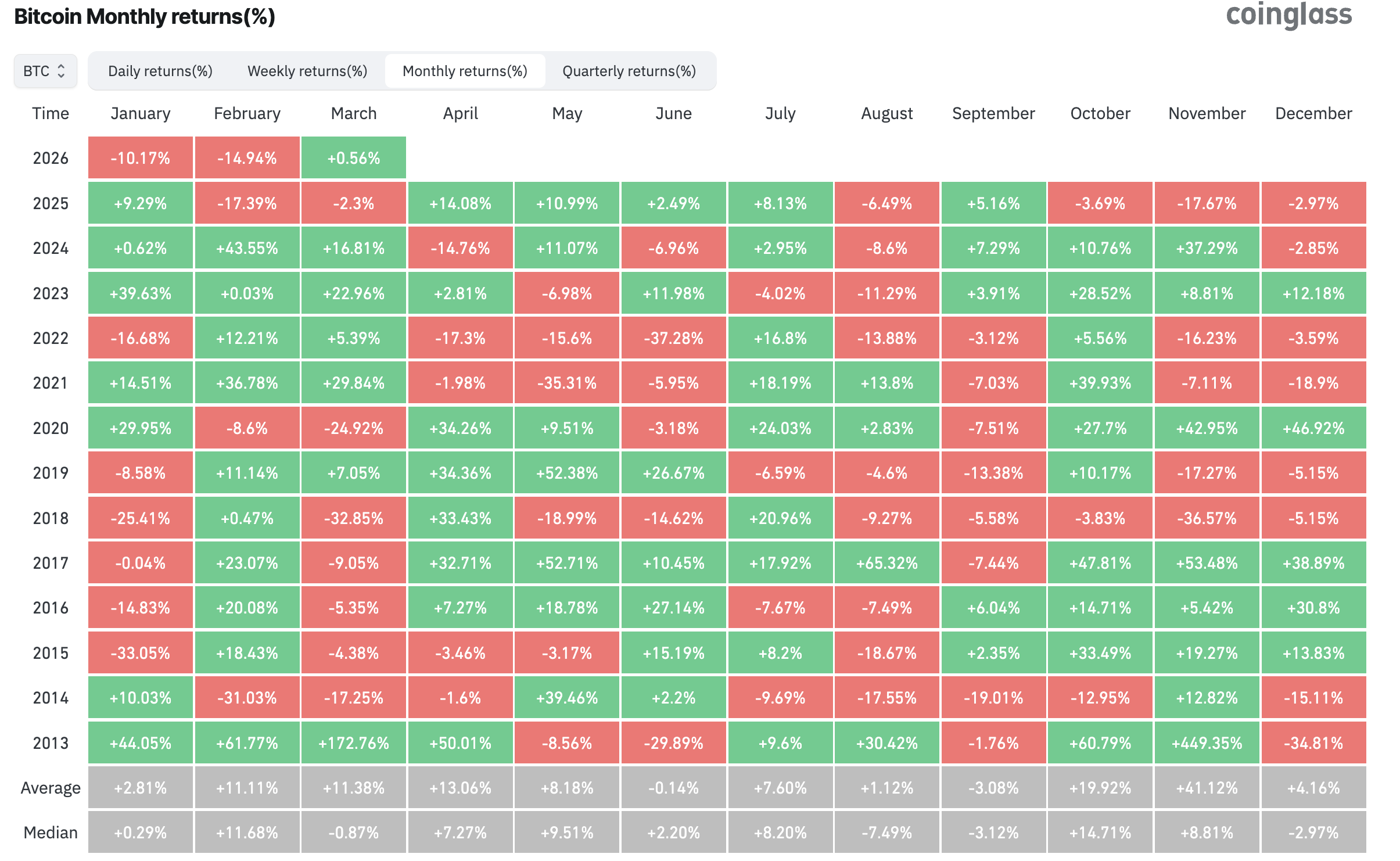 Bitcoin ($BTC) ha tenido cinco meses consecutivos a la baja desde octubre de 2025. En marzo, la criptomoneda líder ha subido casi 0.56% a pesar de los desafíos macroeconómicos.