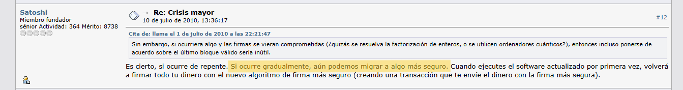 La discusión comenzó cuando un usuario preguntó si Bitcoin se volvería inútil en caso de que las firmas digitales fueran vulneradas. Satoshi respondió que no necesariamente: si la amenaza llegaba de forma gradual, la red podría actualizar su esquema de firmas antes de que el daño fuera irreversible.