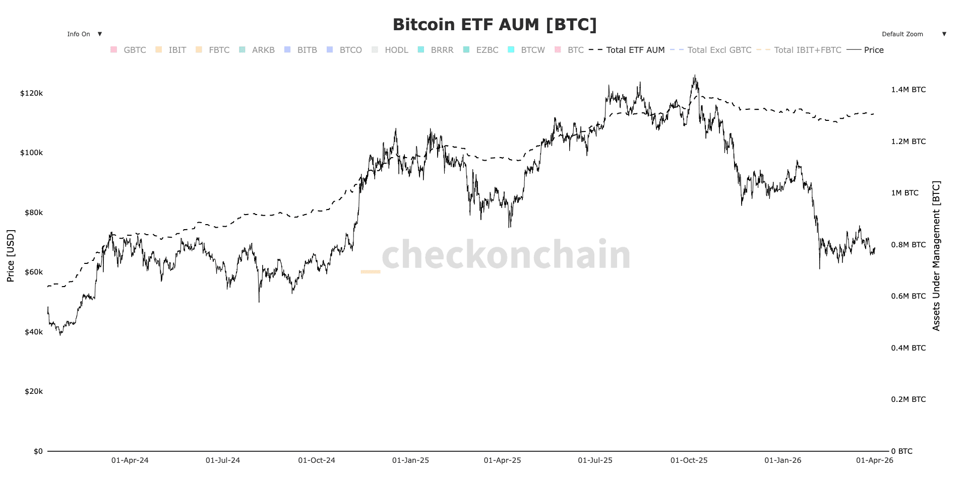 Los activos bajo gestión de los ETF han permanecido relativamente resilientes, sin embargo. Las tenencias disminuyeron de 1.38 millones de $BTC en octubre a un mínimo de 1.28 millones de $BTC, una caída de aproximadamente el 7%, y desde entonces se han recuperado hasta alrededor de 1.31 millones de $BTC, según CheckonChain.