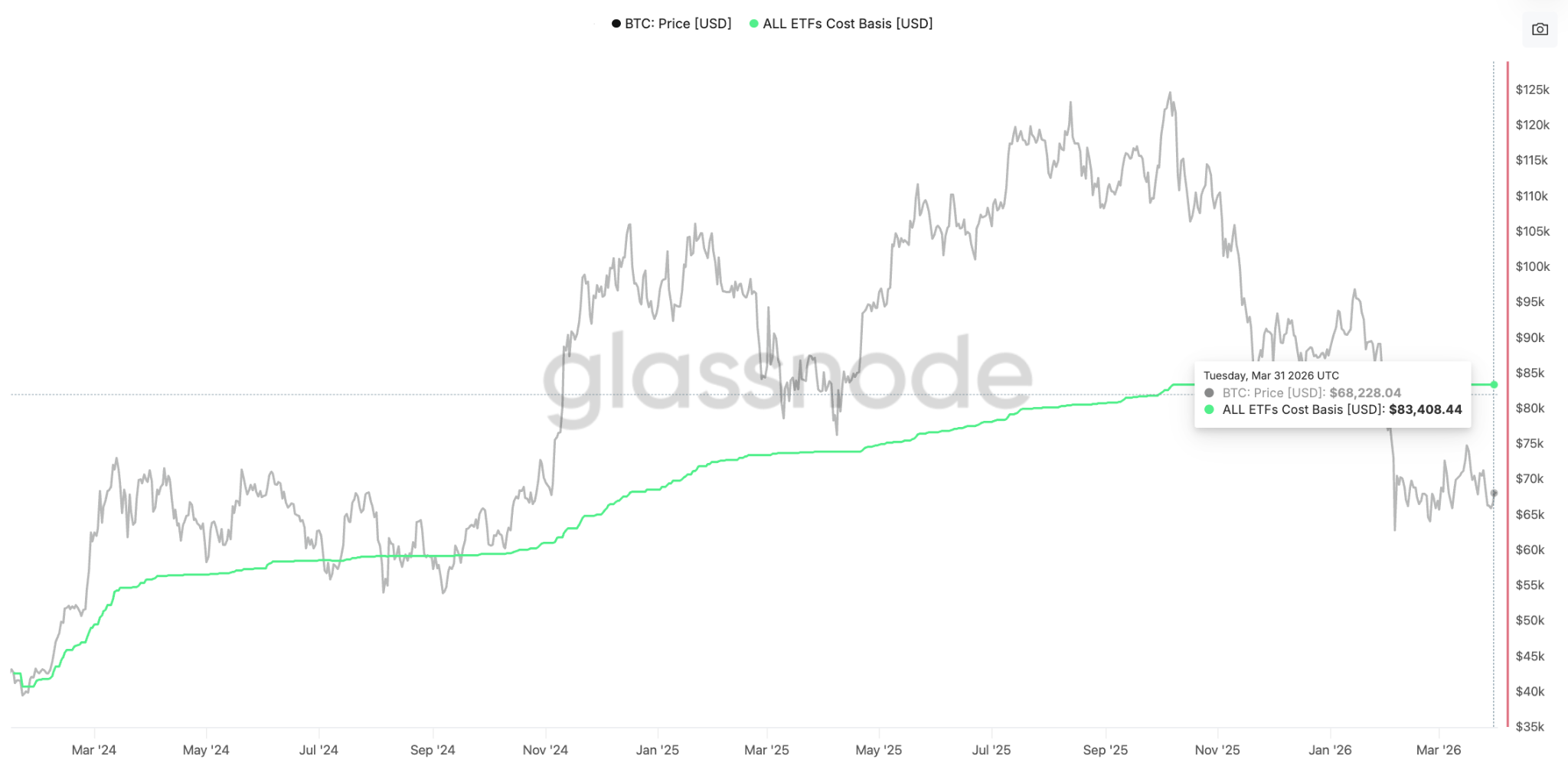 El precio spot de $BTC también se encuentra por debajo del costo promedio de adquisición de los holders de ETF de Bitcoin al contado en EE. UU., actualmente en USD 83.408, lo que sugiere que estos inversionistas están bajo una presión creciente.