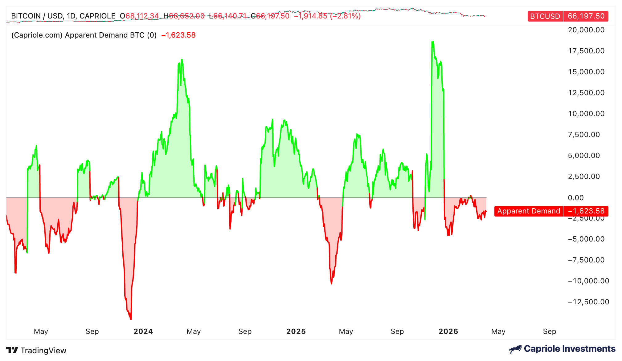 La métrica de Bitcoin Apparent Demand de Capriole Investments muestra que la demanda de Bitcoin se sitúa en -1.623 $BTC el jueves, lo que indica que los vendedores mantienen el control.