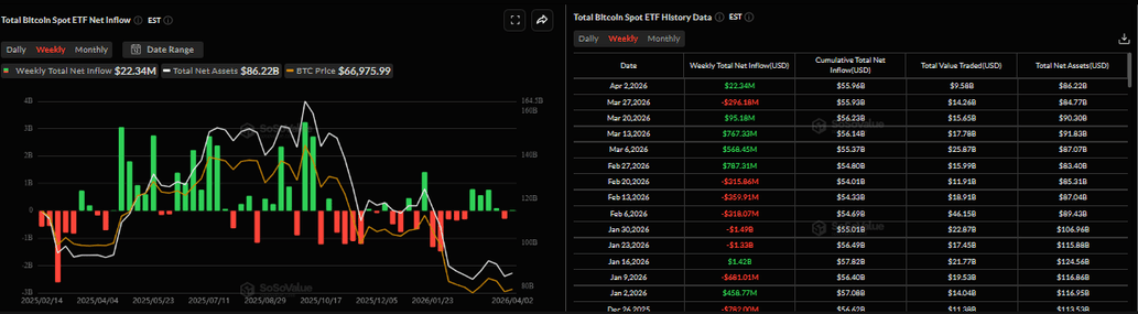 La demanda institucional de Bitcoin muestra un sentimiento mixto con un ligero sesgo alcista hasta ahora esta semana. Los datos de SoSoValue muestran que los fondos cotizados en bolsa (ETF) de Bitcoin al contado han tenido entradas y salidas alternas esta semana, con 3 entradas y 1 salida hasta el jueves, llevando el total neto a 22.34 millones de dólares. Esto destaca la indecisión entre los inversores institucionales, que no están dispuestos a aumentar la exposición al $BTC en medio de la incertidumbre prevaleciente en el mercado.