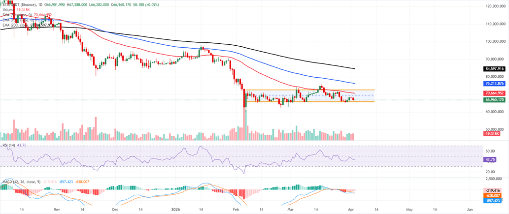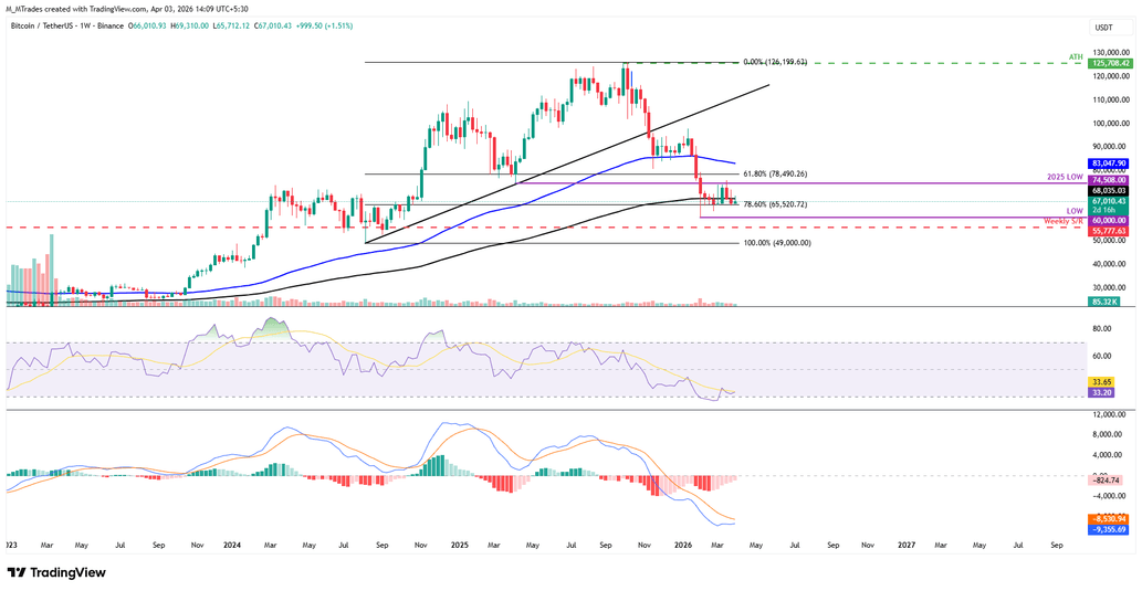 Como se observa en el gráfico semanal a continuación, la criptomoneda más grande por capitalización de mercado enfrentó rechazo alrededor del mínimo anual de 2025 de 74.508$ a mediados de marzo. Cayó ligeramente, cerrando por debajo de la Media Móvil Exponencial (EMA) de 200 semanas en 68.031$. A partir de esta semana, el $BTC ha sido rechazado por la EMA de 200 semanas y cotiza en 67.000$ el viernes.