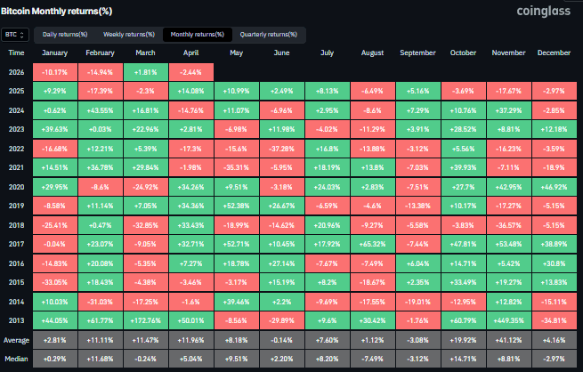 Sin embargo, las tendencias mensuales sugieren algunas señales de optimismo. Históricamente, Bitcoin ha entregado rendimientos positivos en abril, con ganancias promedio del 11.96%. Esta tesis de recuperación se materializaría si los flujos institucionales se reanudan, los desarrollos regulatorios (como la Ley de Claridad) resultan favorables para el mercado cripto en general, y la guerra en Medio Oriente llega a su fin, lo que podría restaurar la confianza de los inversores y el apetito por el riesgo.