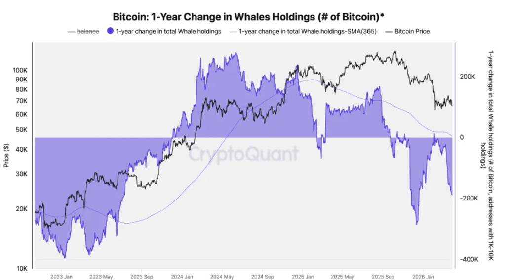 "La SMA a 365 días se mantiene en una tendencia descendente, confirmando que esta distribución es estructural y no temporal. Históricamente, la acumulación negativa sostenida de ballenas ha coincidido con períodos de debilidad prolongada en el precio, y la lectura actual sugiere que la venta sigue siendo un viento en contra estructural significativo", informa un analista de CryptoQuant.