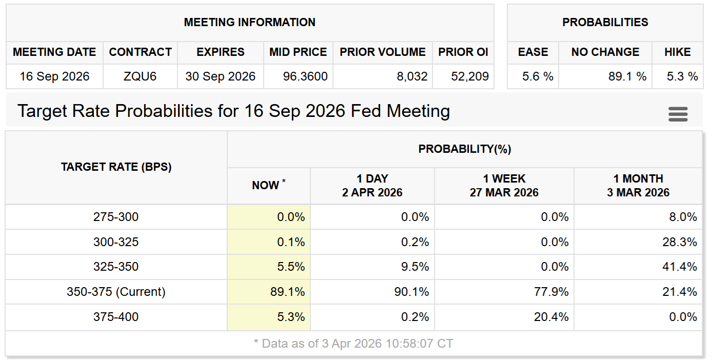 Algunos traders están descontando un 89 % de probabilidades de que la Fed mantenga los tipos de interés estables hasta septiembre, con un 5 % de probabilidades de una subida al 4 %.